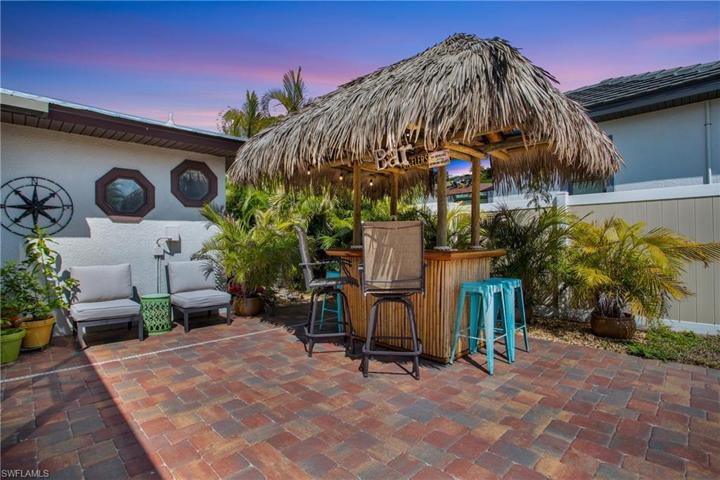 MOTIVATED SELLER, ALREADY BOUGHT ANOTHER HOME. Enjoy captivating water views from this pool home in a fantastic Cape Coral location without the hefty waterfront price! This well-maintained 3 bedroom, 2 bathroom home is on an oversized corner lot in the desirable Orchid neighborhood. Featuring all tile flooring throughout, plantation shutters, a new (2023) metal roof with new front gutters, vaulted ceilings, multiple sliders providing lanai access and filling the home with natural light, a garage with mini-split A/C accommodating 4 vehicles (2 deep), 3 solar attic fans, the list goes on! Inside, you’ll love the open floorplan, featuring a large kitchen with ample cabinetry, granite counters, and stainless appliances. The main suite offers lanai access, a spacious walk-in closet, and a spa-like en suite with dual sinks, a soaking tub and separate shower. Enjoy the convenience of having a laundry room with full size units, plus stackable units in the 2nd bathroom. Step outside into the outdoor oasis, with a caged pool and outdoor dining/living area, plus an open air paver patio complete with a tiki bar! With it’s location close to downtown Cape Coral, a multitude of shopping, dining and entertainment options plus both bridges are just minutes away.
