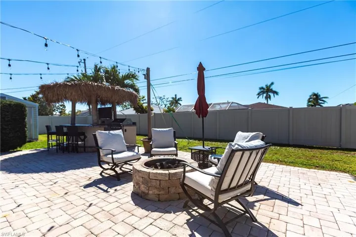 Welcome to your personal paradise in Southeast Cape Coral! This beautifully updated four-bedroom, two-bathroom home boasts an incredible backyard retreat, perfect for entertaining or relaxing in style to live out your FL dreams. The expansive paver patio is complete with outdoor lighting, a tiki bar with an outdoor kitchen, a cozy fire pit, and a sparkling pool, all under a long Cypress wood ceiling that adds warmth and character. A permitted wood shed provides extra storage for your convenience.