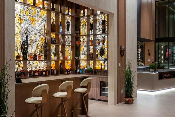 At the heart of the residence is a chef’s kitchen unlike any other, custom designed with professional-grade appliances including a Wolf and Sub-Zero gas range, Pavoni coffee machine, and additional refrigeration. The kitchen is complemented by a display kitchen, bar, and walk-in wine room, creating a culinary environment designed for both daily living and entertaining. Gas, induction, and electric cooking options provide exceptional versatility.