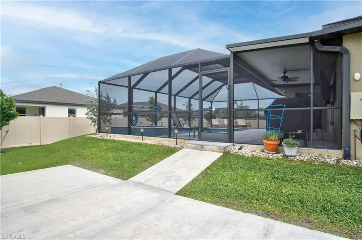 This home features three spacious bedrooms plus a versatile den, two bathrooms, and a convenient two-car garage. The VAULTED CEILINGS lend an open and spacious ambiance, while the screened entryway welcomes you into a world of serenity. Undoubtedly the heart of this home is the top-of-the-line pool and backyard oasis that has been created for your enjoyment, where NO EXPENSE HAS BEEN SPARED. Here you will find a HEATED, SALTWATER POOL with a PRIVATE SPA and aluminum POOL CAGE. The whole pool area is embellished with PORCELAIN TILE, no cheap pavers are found here. The roof line of the lanai has been increased with a COMPOSITE ALUMINUM ROOF FOR EXTRA SHADE AND COMFORT. Beyond the pool, you will find a SIZABLE BACKYARD with enhanced LANDSCAPING enclosed by a PRIVACY FENCE. The landscaping can easily be maintained with the WHOLE YARD IRRIGATION SYSTEM. To round it off there is an OPEN CONCRETE DECK READY TO BE CUSTOMIZED TO YOUR LIKING; whether basking in the sun’s warmth as a SUN DECK, gathering around a cozy FIRE PIT, or storing essentials in a SHED – there are endless possibilities.