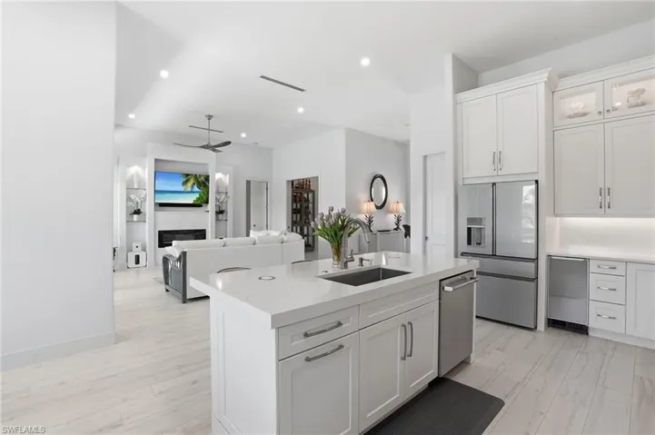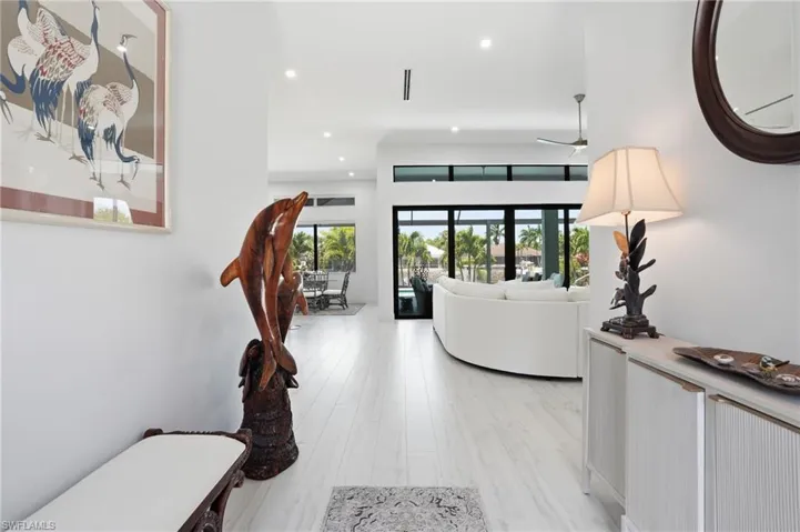 Completed in 2022, this 3-ensuite-bedroom plus office, 3-bath residence offers 2,223 A/C sq ft and 2,847 total sq ft of contemporary design, smart construction, and easy luxury. The private waterfront setup includes an approx. 40′ x 11′ dock/pier with dual access points, 10-ton Golden boat lift, motorized kayak lift, fish light, dock box, 18′ bench with back, large fish-cleaning table, electricity, 5 hose bibs, and dusk-to-dawn dock lighting. Additional exterior highlights include hurricane casement windows with bronze tint for privacy, custom HVAC with linear diffusers for a significant air-quality and design upgrade, no visible roof vents, a 5-foot paved side path, soffit lighting, extensive outdoor lighting with overhead, pool, and accent lights on dimmers, Monte Carlo fans, and a custom lockable enclosure for pool equipment and side-yard storage.