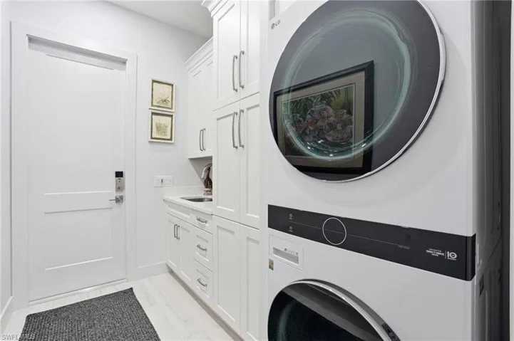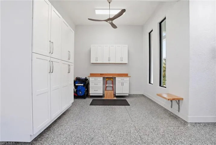 The 2+ car garage features upgraded epoxy flooring, hurricane-grade garage door, Rheem on-demand water heater, portable generator hookup, Rain Bird landscape controls, butcher block workbench, storage cabinets, side entry door, 2 large windows, & 7 ceiling LED lights.