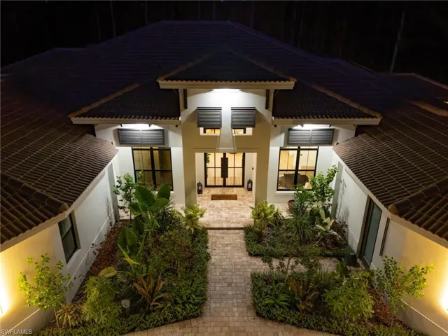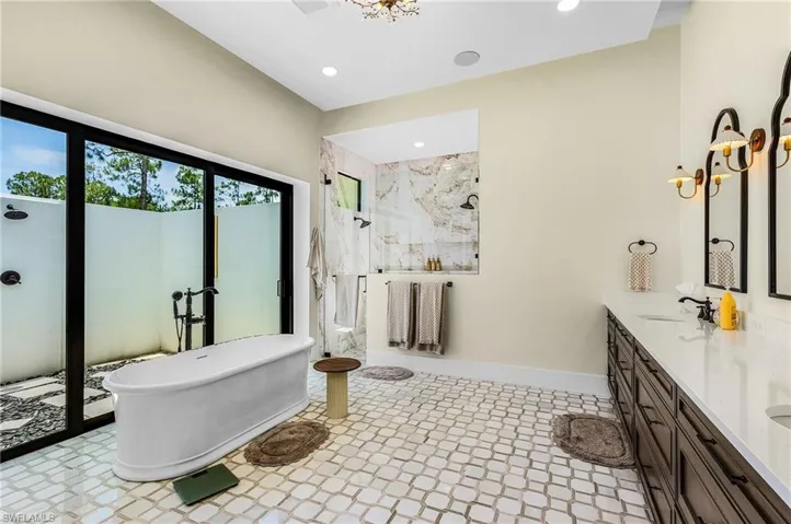 Welcome to your Tropical, Dream Getaway! This BRAND NEW, LUXURY home offers the perfect blend of elegance and comfort with *FIVE En-suite Rooms* !! Located just off Collier and Vanderbilt Beach Rd, this is an Absolute MASTERPIECE! Lush foliage and chirping birds welcome you onto this Private Estate. If you’re looking for a little breathing room, away from the strict constraints of a cookie-cutter, gated community ~ Here you have found it! With four Spacious en-suite bedrooms PLUS an en-suite den, you’ll enjoy a truly indulgent experience with room for everyone. Step inside to discover an open concept living space filled with natural light, showcasing stunning design elements with premium furnishings. The gourmet kitchen, equipped with state-of-the-art appliances is perfect for whipping up delicious meals or entertaining friends and loved ones. Not only is there plenty of space for guests inside, you also have a MASSIVE 2,000 square foot SCREENED lanai to accommodate indoor/outdoor living. Unwind in your own private oasis! The expansive 2.5 acre property features a sparkling pool and XXL jetted spa, surrounded by Custom Landscaping. Whether you are soaking up the sun on the pool deck or enjoying a peaceful evening under the stars, this outdoor space is designed for the ultimate relaxation. Don’t miss the game – on TV or on the sport court! You can watch both from the outdoor living area on the lanai. Convenient half bath located outside. The outdoor kitchen has a beautiful dining set for everyone to enjoy making memories around. Fit for Royalty, you will enjoy the Spacious primary suite with luxurious XL 5-piece bath AND OUTDOOR SHOWER! Get ready to comfy-binge…The Theatre Room has THE Most comfortable, tiered seating/couches, surround sound and an over-the-top movie theatre feel. The great room features an Elegant, formal dining area plus seating at the island. High speed wi-fi and smart home features, plus Ample parking. Located just minutes from world-renowned, sugar-sand beaches, top-notch golf courses and vibrant, shopping and dining options. This home is the perfect base for your next Florida adventure. Guests will enjoy the entire property with its spacious interior home of 5000+ square feet and then a screened in pool lanai and outdoor kitchen with an 85 inch flatscreen TV brings your usable space up to 7000 sq ft. Feel like staying home, but also staying active? SPORT COURT is in the back, set up for pickleball and basketball. Enough room in the grassy yard for your football or soccer game, too. Look no further for your BEST Naples Experience and book this house TODAY!