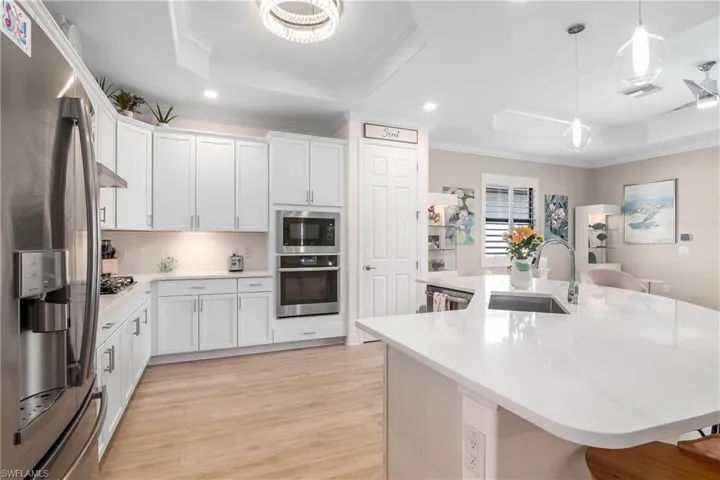 The primary suite looks out to the pool and lake, with a large walk-in closet, a walk-in shower, a Roman tub, dual vanities, and a separate water closet. The home’s screened-in lanai overlooks the lake, with an outdoor kitchen that includes a gas-heated, built-in grill, and a gas-heated pool and spa. And as a bonus, the home is being sold FURNISHED to allow the new owner immediate enjoyment of the home!