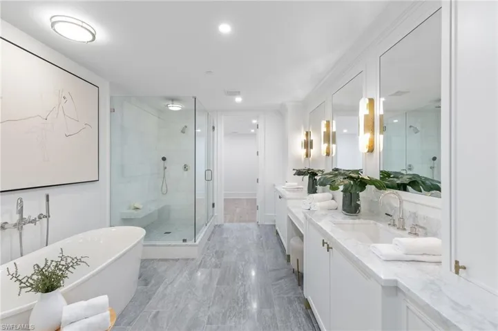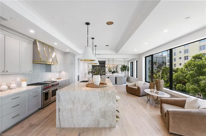 Welcome to your luxurious coastal retreat at 1820 Gulf Shore Boulevard North, Unit 301, Naples, FL. This stunning corner unit boasts 3 bedrooms, 3.5 bathrooms, and an expansive 2976 square feet of living space. Step inside to discover a chef’s kitchen with an island, gas oven, and gas stove, perfect for culinary enthusiasts. The open kitchen flows seamlessly into the grand living area, accentuated by high ceilings and gorgeous moldings. Enjoy the Florida sunshine from your private terrace with water views or entertain guests on the balcony. This residence also features a private elevator, hardwood and tile floors, a wet bar, and a primary ensuite with separate shower and dual vanities. With 2 assigned covered parking and separate guest parking, convenience is paramount. Residents can also relish the benefits of a pool, rooftop deck for sunsets, golf putting area and a common roof deck. Embrace the epitome of coastal living in this exceptional Naples abode.This remarkable residence also includes the coveted feature of a boat dock, offering direct access to the sparkling waters of Naples. With the potential to add a lift, this amenity provides the perfect opportunity for boating enthusiasts to fully indulge in the coastal lifestyle. Residents of this exceptional home have the added benefit of being right across the street from the beach, allowing for easy access to stunning sunsets and leisurely beach outings.