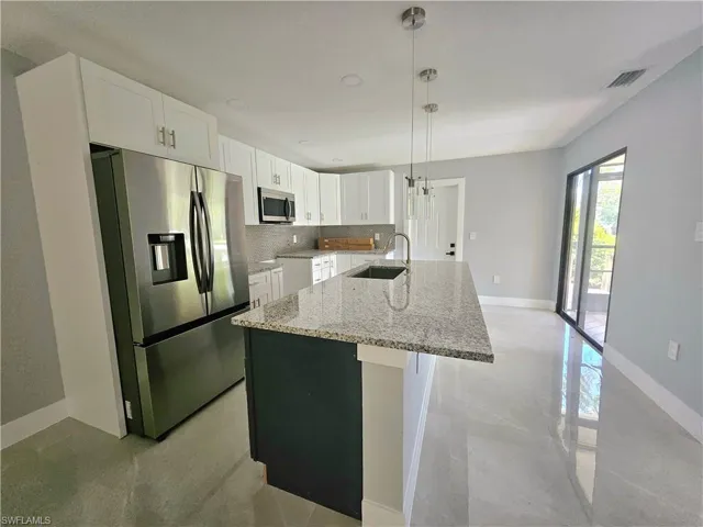 One or more photo(s) has been virtually staged, AI generated or rendered. Nestled in the lush, tropical community of Island Park Village, this beautifully updated 2-bedroom, 2-bathroom duplex offers a peaceful retreat with modern finishes and everyday comfort. The home features elegant porcelain tile flooring throughout and a bright, inviting atmosphere, complemented by a spacious open layout that seamlessly connects the kitchen, living, and formal dining areas—perfect for entertaining. The kitchen is designed with a large island, stainless steel appliances, and ample cabinetry, while a built-in wine bar with glass cabinetry and wine rack adds a sophisticated touch, with space for an optional beverage fridge. Both bathrooms are fully remodeled with modern tile showers and updated countertops, and the master suite includes a spacious walk-in closet for added convenience. Enjoy relaxing on the screened front porch or private lanai, both equipped with ceiling fans and surrounded by lush greenery. Additional highlights include a private 1-car garage, driveway parking, and a dedicated laundry room with washer/dryer hookups. Residents enjoy access to a lakeside clubhouse featuring a fitness center, billiards room, and multipurpose space, along with a variety of community activities including bridge, mahjong, bingo, Rummikub, aquasize classes, and social clubs. Conveniently located near top golf destinations such as San Carlos Golf Club, The Forest Country Club, and Topgolf Fort Myers, this home offers both relaxation and accessibility. Rent is $1,950/month with a minimum 1-year lease; move-in requires first month, last month, and a security deposit equal to one month’s rent. A $40 application fee per adult (18+) applies for background and credit screening. Landscaping and HOA fees are included with full access to community amenities, and a $150 cleaning fee is due at move-out. Terms may be adjusted based on the strength of the application.