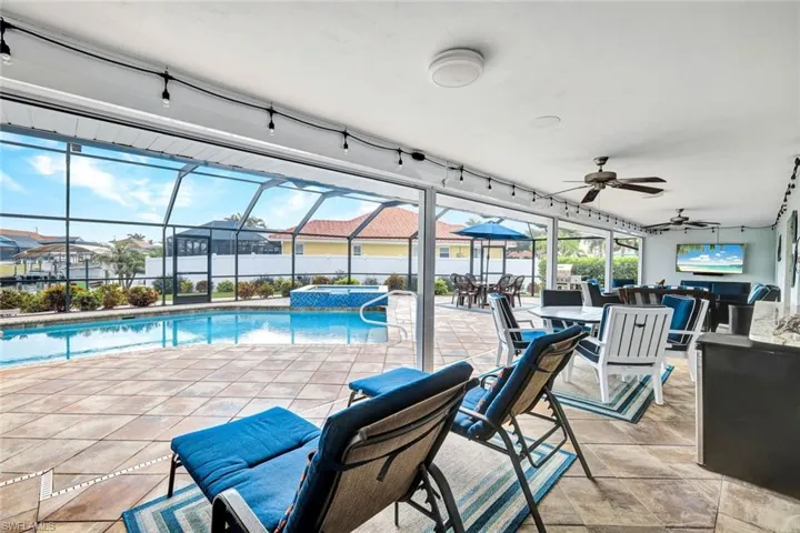 Welcome to your dream waterfront retreat! This captivating, completely remodeled home in Cape Coral offers the perfect blend of comfort, luxury, and outdoor adventure. Boasting just under 2,000 square feet of thoughtfully designed living space, this turn-key residence is ideal for both relaxing and entertaining as a second home or completely equipped as an AIRBNB. The open-concept layout enhances the spacious feel of the home, creating a seamless flow between the living, dining, and kitchen areas. Large windows fill the space with natural light and showcase picturesque views of the canal. The modern kitchen is a chef’s delight, featuring stainless steel appliances, ample cabinetry, and a spacious island perfect for casual dining. This home includes three generously sized bedrooms, with the master suite designed as a tranquil retreat featuring an en-suite bathroom and direct access to the outdoor patio. Additionally there is a brand new queen-sized Murphy bed which adds versatility for guests or additional family members. With three full-sized bathrooms, the home ensures convenience for family and guests alike, each featuring quality fixtures and finishes. The extra-large screened-in lanai is perfect for year-round enjoyment, featuring a large hot tub that flows into the pool. The lanai has been pushed out to maximize sun exposure throughout the day, creating an ideal space for relaxation and entertainment. Enjoy endless outdoor fun with a professionally installed 4-hole putting green and a bean bag toss game in your backyard. Circular paver drive and walk all the way around the home. The property includes a 10,000 lb boat lift with a canopy, allowing for unobstructed access to the canal and Gulf waters, whether you’re fishing, boating, or simply enjoying the water, this home is a boater’s paradise! The backyard features new artificial turf, reducing maintenance while providing a beautiful green space. New privacy fencing with low-voltage lighting surrounds the property, enhancing both security and ambiance. This home