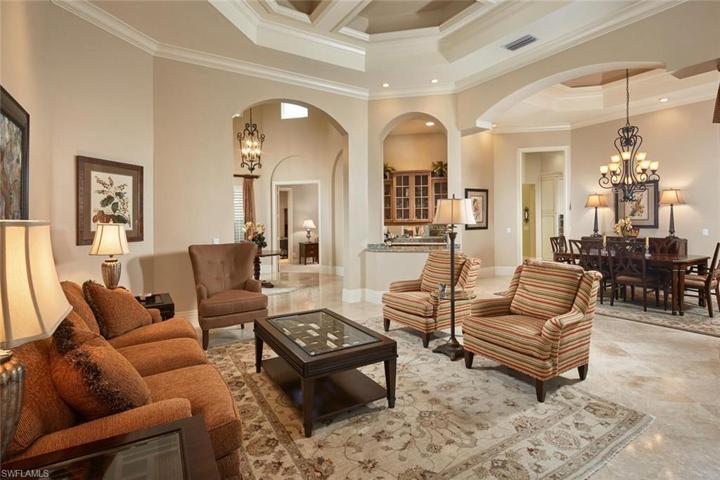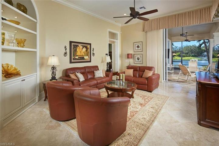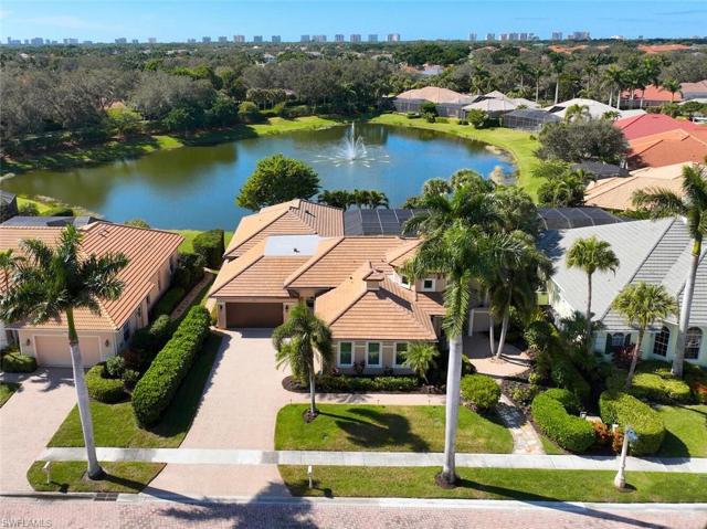 Welcome to Watercrest where this four bedroom, den, three and a half bath home delivers sweeping views of a peaceful lake accented with a soothing fountain. Double doors open to a large entry space with soaring ceilings, leading to the living and dining space built to capture the water views through a wall of windows and a wet bar for entertaining. The kitchen and family room offer casual living with disappearing sliding doors that open to the lanai for relaxed living. The renovated kitchen provides a center island, generous cabinet space, and walk in pantry. A private primary suite boasts tray ceilings, dual closets, and views of the pool and water. Separate guest bedrooms are perfect for family and friends. Features include newer roof, impact windows/doors, coffered ceilings, 2 car garage split parking (2 car, separate 1 car can be converted back for 3 car). Pelican Marsh is a guard-gated community, close to beaches, two Ritz-Carlton resorts, shopping at Mercato and Waterside Shops. The community center hosts an exceptional fitness facility, competitive tennis program, bocce ball, pickleball, and optional Pelican Marsh Golf Club memberships are available.