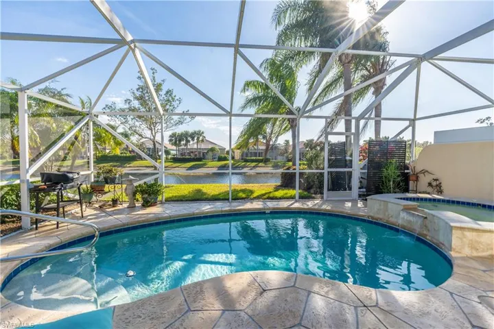 A covered, stamped concrete lanai adjoins an enclosed pool cage housing an inviting kidney shaped pool/spa with waterfall feature. From here, a deep lawn leads to the quiet water’s edge flowing by the rear of the unit. This home is storm protected with accordion shutters on all windows and electric models shielding the lanai. A new, contemporary glass front door and exterior lighting present a fresh face to the home. Enjoy Naples living with ease in this tropical retreat.