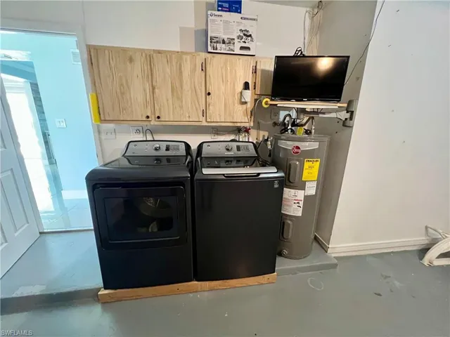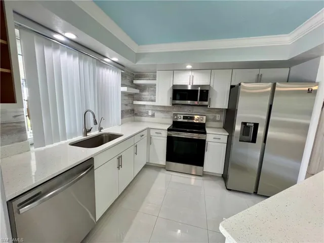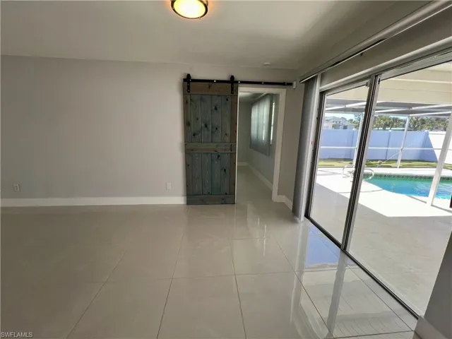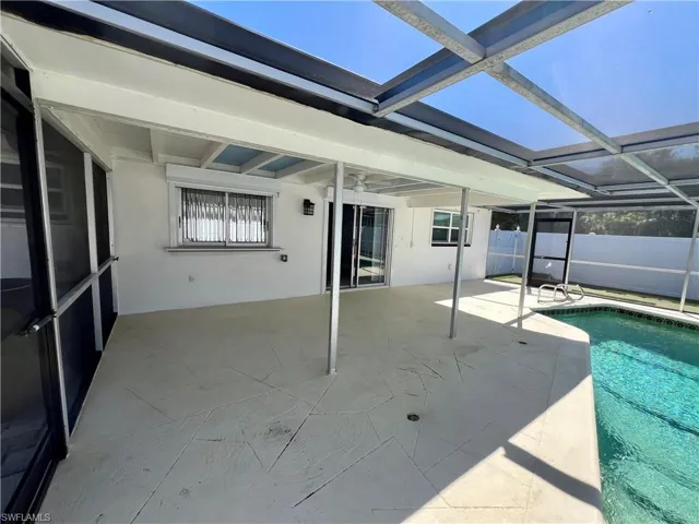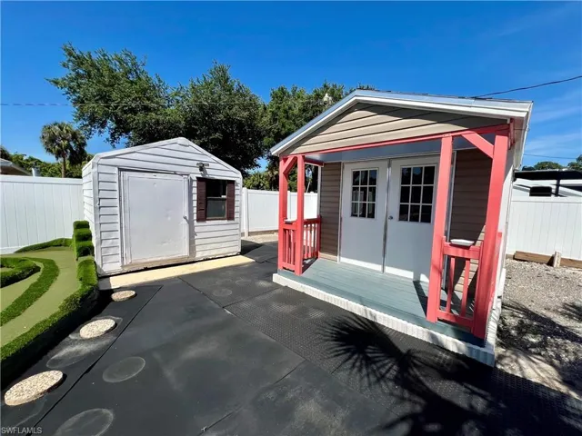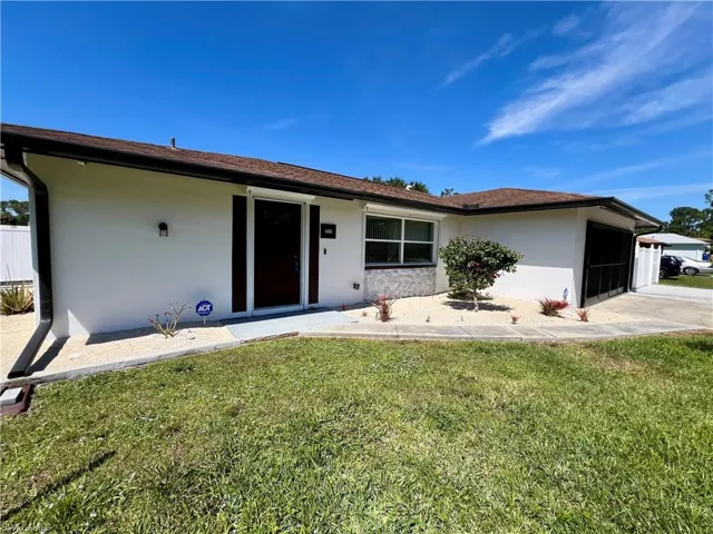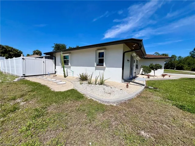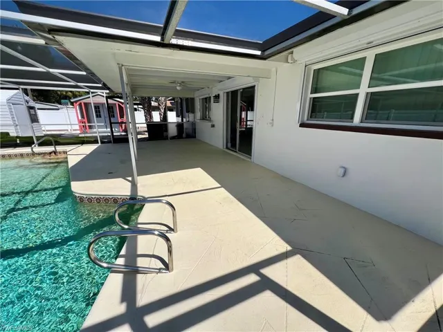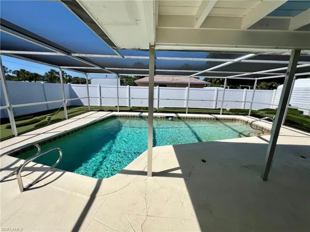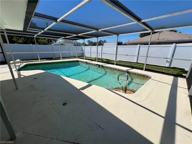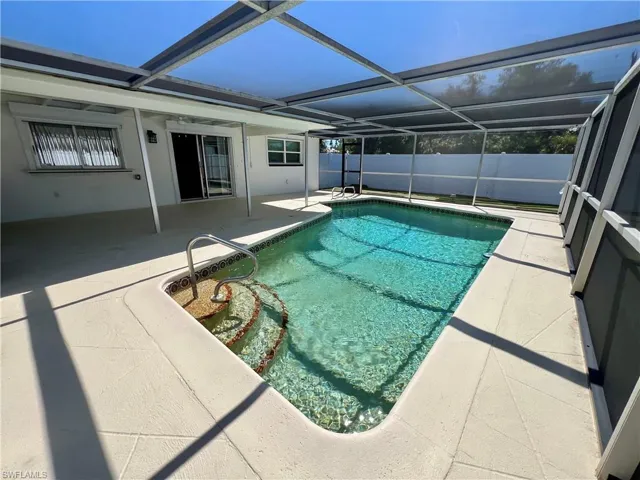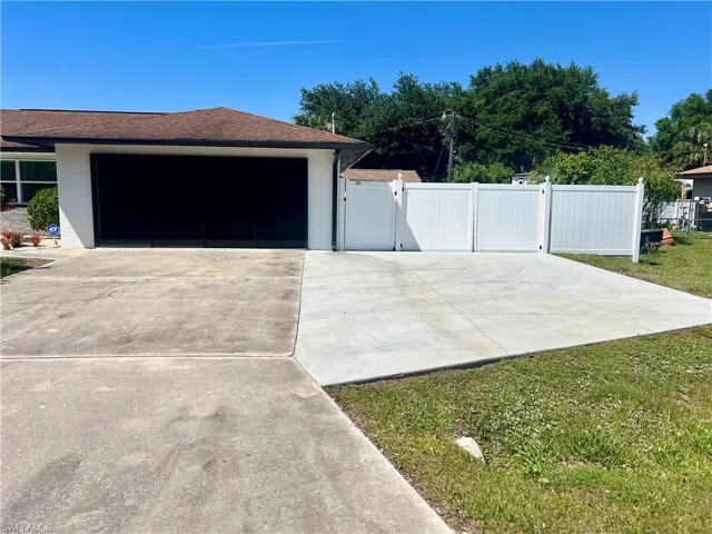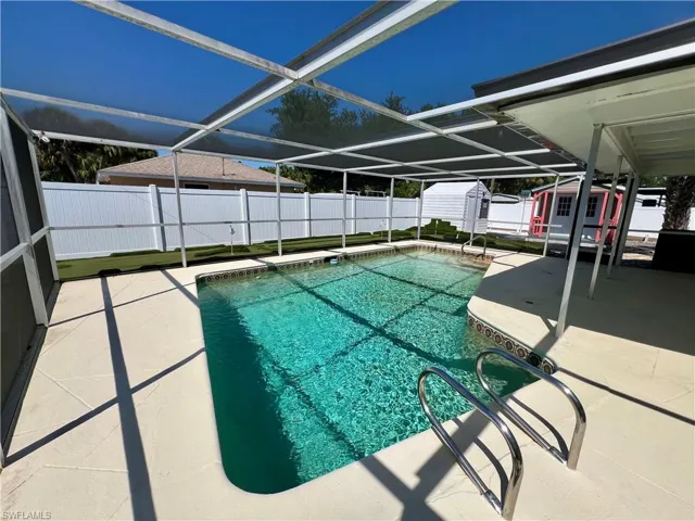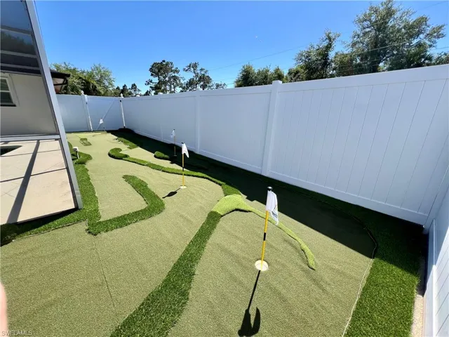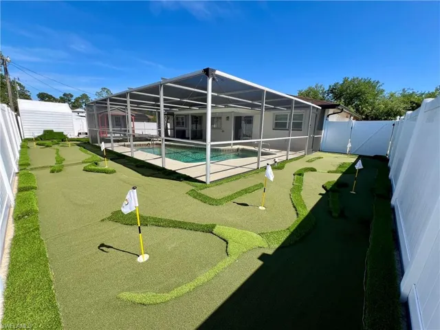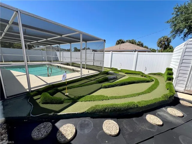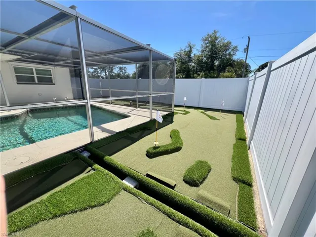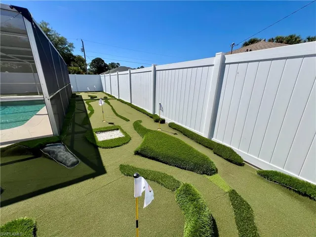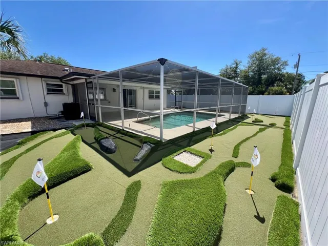 Affordable POOL HOME recently remodeled throughout with it’s very own 9 HOLE MINI GOLF COURSE WITH LED COLOR CHANGING LIGHTS, 6 FOOT PVC PRIVACY FENCE WITH 3 GATES surrounds this low maintenance yard with side driveway for secure BOAT/RV PARKING, two storage sheds, one newer 10 X 14 SUPERIOR shed plus another 10 X 12 shed both with electric, no grass to cut in the backyard, SCREEN ENCLOSED IN GROUND CONCRETE POOL WITH NEWER ELECTRIC HEAT PUMP and newer pump motor, new screening on the pool cage with new screen doors and hurricane cables, plenty of covered and open deck space for entertaining, pass through from kitchen to the lanai, corner lot with oversized double garage with sliding screen doors allow you to work in the garage on low traffic street with plenty of privacy, well landscaped front yard with extra concrete pad for access to double gate and yard for additional parking, beautifully upgraded interior, 24 inch shiny porcelain tile floors throughout, freshly painted interior, newly remodeled kitchen with QUARTZ COUNTERTOPS and Samsung stainless steel appliance package, all new wood cabinets with island countertop, CROWN MOLDING, newer LED lighting throughout the interior, three new HUNTER ceiling fans with remotes, BARNYARD DOORS lead to master bedroom with large walk in closet with another BARNYARD DOOR and private en suite master bath completely remodeled with new vanity and fixtures, extra high commode, decorative accent wall and newly tiled shower, guest bath has also been remodeled with new vanity and fixtures, high commode and all new shower also with decorative accent wall, split bedrooms for privacy, STORM SMART SHUTTERS, some motorized with remotes and some accordion style and manual with hand cranks, newer water treatment equipment in 2024 with partial RO system in the kitchen, Swann Security system with 7 cameras, NEW DIMENSIONAL SHINGLE ROOF IN 2015, NEW WATER HEATER IN 2014, newer washer/dryer with storage cabinets above, new gutters and downspouts in 2022, NEWER INSULATED WINDOWS for energy efficiency, low maintenance home in excellent move in condition located just minutes to I-75 and Ft Myers.