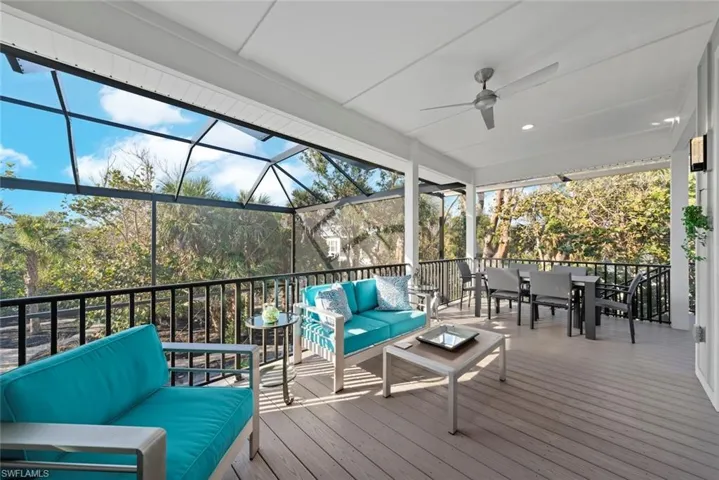 Step into the expansive ground-level foyer, built with weather-resistant materials to withstand the island climate. From here, take the private elevator or stairway to the main living space or access the thoughtfully designed garage. The foyer is seamlessly connected yet separated by a second interior hurricane-rated door for added security. The second-floor living area is bathed in natural light, thanks to impact transom windows that make turning on the lights during the day nearly unnecessary. Every window frames breathtaking views of lush tropical foliage, creating a luxurious treehouse-like ambiance. The open-concept great room is complemented by an additional sitting area—perfect for entertaining or unwinding with a book. The designer kitchen is a chef’s dream, featuring custom gray shaker-style cabinetry paired with a striking blue island, quartz countertops, a glass tile backsplash, stainless steel appliances, and a gas range. The great room, dining area, and kitchen all open onto a wraparound Azek deck, which overlooks the custom heated pool—all fully enclosed with no-see-um screening for year-round enjoyment. The primary suite is nothing short of a sanctuary. The en-suite bath is a masterpiece, showcasing a custom tiled shower with rich hues of deep blue, taupe, and navy and custom cabinets as well as an expansive walk-in closet. Two spacious guest rooms share an equally impressive guest bath, complete with custom glass shower, exquisite cabinetry and countertops, and designer tile. Ample storage, a walk-in pantry, and attic access with pull-down stairs add to the home’s practicality. Outside, the pool area is a tropical paradise, featuring a sparkling heated pool with a water feature, elevated pool equipment, and a hurricane-rated screen enclosure with concrete-filled supports. Stroll through the lush gardens, filled with native flowering plants and meandering pathways that attract butterflies. A raised herb garden allows you to grow fresh herbs and vegetables right at home. For beach lovers, Bowman’s Beach, renowned as one of the best shelling beaches in the world is just a short walk away. Plus, the home is minutes from Sanibel’s extensive 26+ miles of bike paths, offering endless opportunities for outdoor adventure. This is more than a home—it’s an island retreat where luxury meets nature in perfect harmony. Don’t miss your chance to own this exceptional piece of paradise!