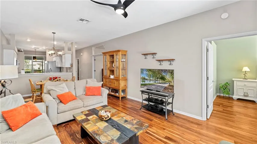Original owner! This well-maintained villa with a great floor plan is flooded with natural light and boasts breathtaking lake views and lush landscaping that greet you as soon as you step inside. The peaceful surroundings create an atmosphere of tranquility, making this a true sanctuary. This spacious single-story floor plan offers 2 bedrooms, a versatile den (perfect for an office or third sleeping space for guests), 2 full bathrooms and a 1 car garage. The open layout provides a seamless flow, with large windows bringing the outdoors in and creating an airy, expansive feel—like a single-family home without the exterior maintenance! Tile and genuine hardwood floors throughout (NO Carpet). The Owner’s Suite features a cozy bay window with serene views of the backyard, allowing you to unwind in privacy and peace. For outdoor enjoyment, there’s an extended lanai for soaking up the sun and fresh air. Also, with a one-car garage, you’ll have plenty of space for storage, making this home as functional as it is beautiful. Located in one of North Naples’ most desirable communities, Heritage Greens offers the best of both worlds: affordable, luxurious living with no golf course maintenance fees! Whether or not you play golf, you’ll love living adjacent to the public Arrowhead Golf Course and enjoying all the amenities, including pickleball, tennis, and two community pools. The neighborhood is also pet-friendly, with up to two pets allowed, so your furry friends can enjoy the Florida lifestyle too. Perfectly positioned for convenience, you’re just minutes from Seed to Table, the pristine Gulf of Mexico beaches, shopping and dining at Mercato and Logan Landing, and close to I-75 for easy access to all of Southwest Florida. Plus, with low HOA fees and being in the preferred X-Flood Zone and shutters (manual) for hurricane protection, you’ll enjoy peace of mind with lower insurance premiums—most lenders won’t even require flood insurance here! This villa is an excellent opportunity for a first-time homebuyer, seasonal resident, or anyone looking to experience the best of North Naples. This home is move-in ready and waiting for you to make it yours. Don’t miss out on this rare find—schedule your showing today and start living the Florida lifestyle you’ve always dreamed of!