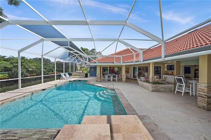 Beautifully renovated estate home, nestled on a lushly landscaped lot with picturesque, endless golf course views and the best in outdoor living with 2000 SF of pool & lanai space. As you step inside, you’ll be greeted by soaring vaulted ceilings with lots of of natural light and just over 3500 SF of luxury living.The heart of this home is the well designed chef’s kitchen, featuring a large quartz island that is perfect for meal preparation and gathering with friends & family. Also, equipped with GE Monogram Appliances, including induction cook top, 30 cubic foot stainless steel Kitchen Aid refrigerator, enormous storage space, and elegant finishes. This home features a split bedroom floor plan, lots of storage, gas fireplace and a generous primary suite.The expansive 800 SF covered lanai where you’ll find a resort-style pool complete with a captivating waterfall spa and summer kitchen, all perfect for entertaining & relaxing. In addition, home boasts newer AC’s and hot water heater, hurricane impact windows and sliders and whole home generator. Low HOA fees include fiber optic high speed internet & cable.Minutes to beaches, dining and shopping. Membership to Club is optional.