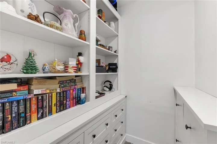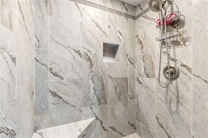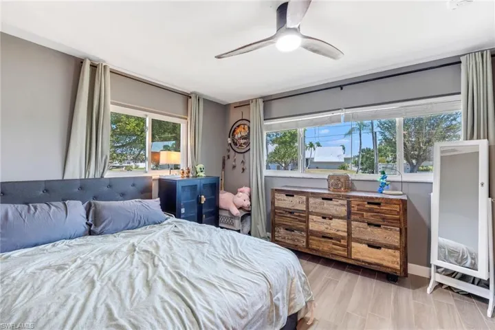 The primary suite overlooks the canal and features a built-in fireplace, custom closets, and an ensuite bath. Guest rooms include built-ins, while the guest bath is upgraded with a multi-jet shower system and LED-lit mirror.