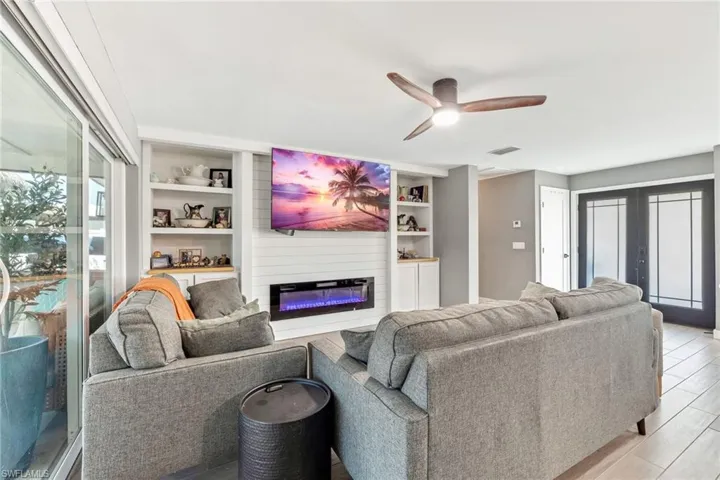 Inside, the open-concept layout is filled with natural light and designed for easy living. The updated kitchen showcases white wood cabinetry, quartz countertops, a farmhouse sink, custom backsplash, and a large center island with generous seating. The living area offers wide water views, a custom shiplap feature wall, and an electric fireplace, with hurricane-rated sliders opening to a covered, screened lanai.
