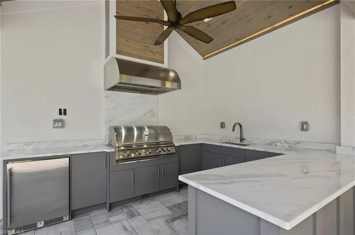 The outdoor space is truly exceptional — featuring a sprawling screened pool deck, full outdoor kitchen with grill, vent hood, refrigerator, weatherproof cabinetry, granite finishes, and a dedicated BBQ dining area. The owner has also upgraded the pool experience with a new saltwater filtration system and an upgraded pool heater, providing easier maintenance and year-round comfort.