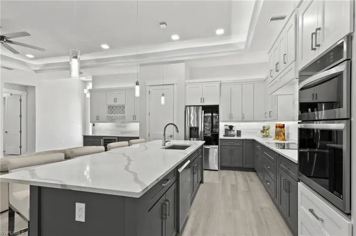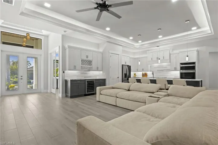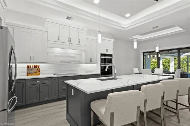From the moment you arrive, the circular driveway, lush tropical landscaping, and impressive elevation (9.2 feet above FEMA requirements) create a commanding first impression. Inside, the home showcases a sleek, modern aesthetic with bright white and gray finishes, real wood designer cabinetry, quartz countertops, and high-end appliances included.