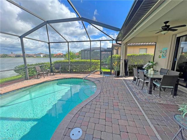 WOW, gorgeous lakefront pool home in the highly desired location at the Forum. 4 bedrooms, 3 full baths, 2-car garage, and a spacious pool area with an absolute dream view. The interior of the home features the comfortable layout of the famous Trevi floorplan from Lennar Homes. Great room & split bedroom design, screened front entry, covered sitting area on the pool lanai, kitchen with stainless steel appliances & big granite countertop kitchen island. The large master suite has his/her walk-in closets and comes with separate tub & shower and dual sinks. In addition, 18-inch diagonal tile throughout the complete home, plus pavers on the entire pool deck and even on the driveway & entrance. Hurricane shutters built in. And if you think it doesn’t get any better, all of this comes turnkey furnished and move-in ready. Low HOA fees include your lawn maintenance plus irrigation. Prime location next to the Forum with easy access to I-75 on 2 exits. Within a 15 minutes drive, you can reach the Fort Myers River District, the Edison Mall, the international airport, or Gulf Coast Town Center. Shops and restaurants are within walking or biking distance. Get your piece of paradise now!