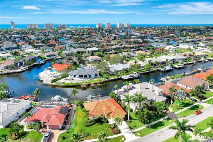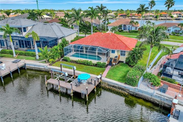H12853 You will feel the love of this four-bedroom waterfront island home the minute you walk through the door! This bright and cheery home offers an open floor plan, high vaulted ceilings, long water view and a split floor plan for owner privacy. The Livingroom sliders roll away to open your entertaining space into the screened lanai and pool deck. The beautifully updated owner’s bathroom offers a spa- like retreat with a soaking tub, dual vanities, and beautifully tiled shower. The owner’s bedroom has access to the lanai. The heated pool takes full advantage of the Southwest facing exposure and is large enough for the whole family! Don’t be surprised to find dolphins in your canal as you take the boat into the gulf for a sun-filled day or enjoy watching the sunset from your dock. Unbeatable location with a 14’ bridge clearance into the Gulf. Close access to many shops and restaurants in the renovated Marco Town Square, walking distance to Veteran’s Park & Farmers Market to name a few. Other notables: H2O heater 2023, roof 2018, new PEX piping 2018. Don’t let this one get away!