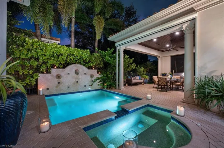 Designed for effortless living, the residence integrates luxury with practicality at every turn. Impact windows and doors, a whole-house generator, dual-zone climate systems, and a tankless gas water heater ensure peace of mind. Outdoor living is equally refined, with a lanai appointed with automated bug screens, a summer kitchen with refrigerator, and a beautiful pool, fountain and spa, supported by advanced systems for year-round enjoyment.