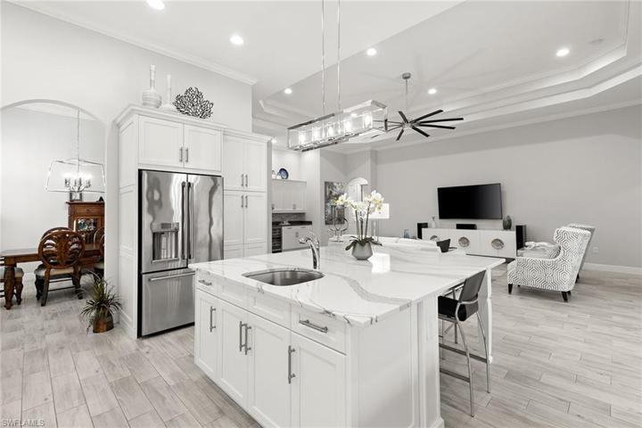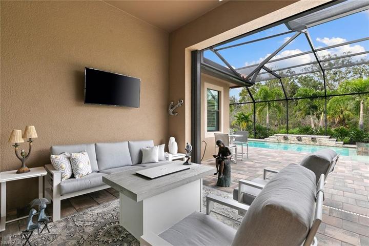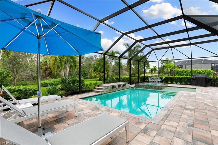 In a serene, natural setting in The TwinEagles Club in Naples, this exquisite three-bedroom plus den home offers a perfect blend of luxury and tranquility. Featuring three full baths and a coveted three-car air-conditioned garage, the property promises comfort and convenience. The heart of this home is its private lanai, boasting a saltwater pool and spa for year-round enjoyment, capturing the essence of Florida living. Deeded to the property is a social membership to The TwinEagles Club, providing access to the newly renovated clubhouse and select golf privileges in season, and unlimited in the off-season. Impact windows and doors throughout the home ensure protection and energy efficiency along with an electric storm screen on the lanai for added comfort and protection. The bright and airy interior accentuates the charm of Florida, creating an inviting and refreshing atmosphere. This home is a retreat, offering a unique opportunity to experience upscale living harmoniously intertwined with the beauty of nature in Naples.