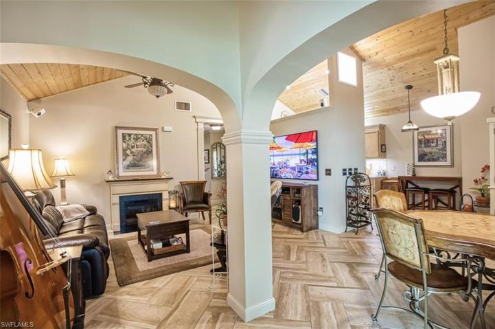 Charming and beautifully maintained villa in Terraverde. Designed and decorated to feel like a garden villa in the countryside, this unique and thoughtfully updated home is like no other in the community. Private covered porch entry leads you to 3 full bedrooms set w/ a Murphy bed for dual purpose office and workout space. Beautiful 12″x24″ tile laid in a herringbone pattern throughout the entire home. Vaulted ceilings with shiplap tongue and groove provide drama to the kitchen and greatroom and a feeling of space and light. The kitchen has generous cabinetry and counter space, pantry storage and stainless appliances. The well laid out owner’s suite features a luxury bath with custom shower and cabinets, excellent storage space and closets. Step out the back to your sanctuary garden – covered patio seating, paver court area, beautiful tropical plants, patio seating on the side yard, and even an outdoor shower. Covered attached parking. NO FLOODING or STORM DAMAGE. Terraverde has great amenities and low fees! Boat launch on site with gulf access and great fishing. Renovated clubhouse, pool, pickleball, tennis and restaurant included! Golf is public with membership options
