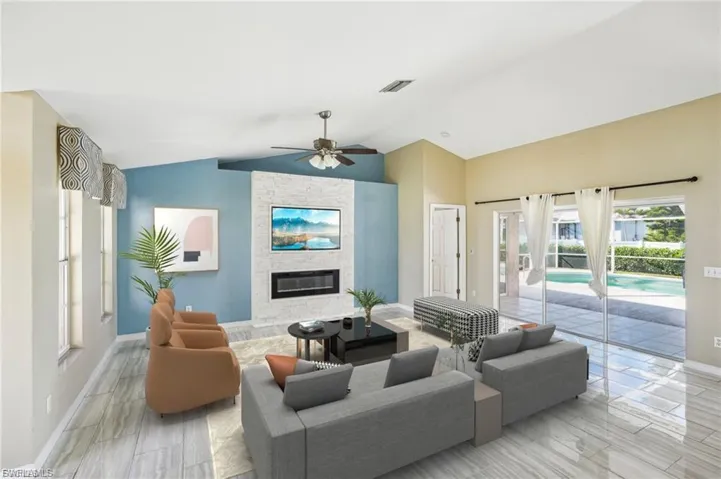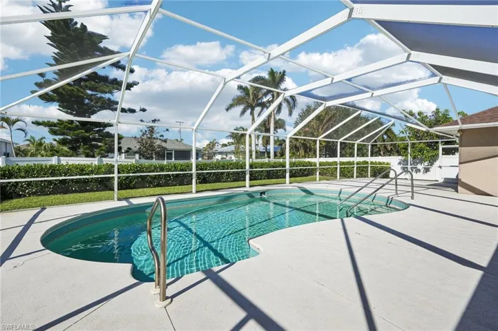Step inside to soaring vaulted ceilings that create an open, airy feel, complemented by a cozy built-in fireplace and a stylish dry bar or coffee nook that’s perfect for entertaining guests or starting your day. The spacious kitchen features granite countertops and sleek stainless-steel appliances, offering the ideal blend of functionality and modern design for everyday living. Out back, your private oasis is ready to enjoy year-round. The heated chlorine pool invites relaxation in every season, while the oversized screened lanai and pool deck provide plenty of space for gatherings, quiet evenings, or soaking up the Florida sunshine. With its desirable location, thoughtful updates, and move-in-ready condition, this home offers the perfect combination of comfort, lifestyle, and long-term value. Schedule your private showing today and experience the best of Cape Coral living before this opportunity is gone.