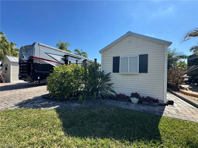 Let me tell you a little story about Lot 144, Imagine turning onto a quiet little street where coach houses line only one side and a lush tropical preserve stretches along the other. It feels peaceful, private, like you’ve stumbled onto your own hidden retreat. And then you see it,the lake view. Sun dancing on the water. A gentle breeze moving through the palms. That’s when you know you’re home. The entire lot is beautifully pavered, framed with newer palms and landscaped beds on both sides, giving you just the right touch of privacy from your neighbors. It’s polished, but relaxed. Tropical, but easy. Now step inside the coach house and here’s where the charm kicks in. Warm wood accents give it that cozy cabin feel, complete with a Murphy bed ready for guests. There’s a convenient bathroom, a mini kitchenette, shelving for your favorite books and treasures, plus a movable bar with stools and a TV, because happy hour should always be flexible. But the real magic? The enclosed screen room with direct access into the coach house. This is where mornings begin with warm coffee and soft lake views. It’s where afternoons drift by with a tropical breeze and maybe a little nap. Evenings? That’s when conversations linger, laughter carries, and the Big Green Egg gets fired up for smoked ribs or the perfect steak. Rain stays out. Pests stay out. Good times stay in. And when you feel like taking a break from cooking? A short stroll brings you to the River Clubhouse where friends, good meals, and a lively social calendar are waiting. Afternoons might find you poolside with a beverage from the cabana, soaking in the Florida sunshine. Beyond your own slice of paradise, the RiverBend lifestyle unfolds along the peaceful shores of the Caloosahatchee River. Think sunset strolls, boat watching, and that calming river breeze. The resort pool, hot tubs, and River Clubhouse buzz with live music, trivia nights, themed dinners, and holiday celebrations. Pickleball, bocce, Zumba, line dancing, Creations Guild, remote control boating on the lake, the RC race track, and Texas Hold ’Em nights, there is always something happening. Even your four-legged friends have their own beautifully maintained dog park. Lot 144 isn’t just a property. It’s sun on the water. It’s quiet enjoyment. It’s entertaining with ease. It’s morning coffee, afternoon naps, smoky barbecue evenings, and a community that feels like vacation every single day. This is waterfront Class A motorcoach living that is wrapped in charm, comfort, and just the right touch of playful paradise.