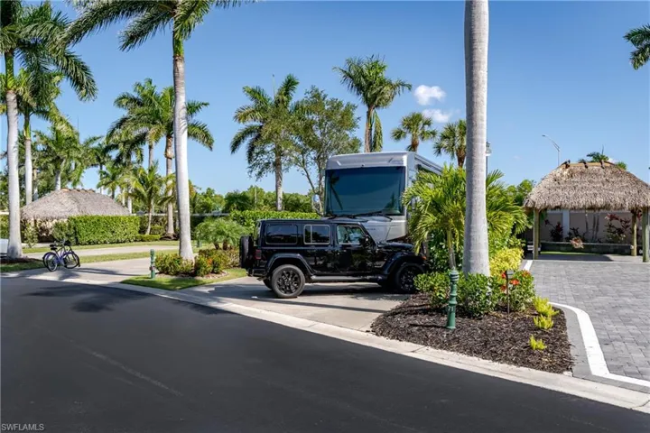 Lot 72 – You drive through the gates after admiring the beautiful flower and Royal Palm lined entry and the two fountains you passed have already welcomed you. As the gates swing open you are now facing an even more magnificent fountain in front of the clubhouse. You now turn and head to your slice of paradise, once again you cannot believe how beautiful this road is lined with Royal Palms… As you back into your beautiful paved lot, you admire the beautiful formal landscaping on your property. Now that you are settled in, you head back to your tiki and you decide to sit and relax with the beverage of your choice as you watch your favorite show. Once again you marvel at your landscaping and the privacy you have with the beautiful back wall. Your furniture is pristine under your synthetic roof tiki that you will have many years of enjoyment from. As you are comfortably in your tiki with the sound of breezes from your massive ceiling fan, you look forward towards the front of your property and as dusk falls see the lights on all of the royal palms before you… Ah… paradise…. You plan to have dinner outside at your dining table tonight. Perhaps you will pull down your screens on the tiki for a little extra privacy. As you are planning dinner, you see your furry best friend rolling in the lush grass, so perfect for Fido…… You marvel at the privacy you have and contemplate potentially adding a second water feature. But for now, you are so happy to be in paradise and enjoying your property. What shall you do tomorrow?? Perhaps take one of the community kayaks and launch from the boat ramp and go through Rookery Bay. Maybe you will buy a boat, how convenient would that be to launch and go to the beach or boat up to a restaurant for lunch or dinner from within the resort? Perhaps it is time to learn how to play pickleball and play on one of the three courts? Probably best to build up those muscles first in the fitness center and then sit in the sauna. So many options! Welcome to the magic that is Naples Motorcoach Resort. Naples Motorcoach Resort is a Class A only resort and boasts a beautiful infinity pool, hot spa, exercise room, men’s and ladies saunas as well as a catering kitchen that owners can use. There are also two satellite pools with a hot spa, their own rest rooms and a laundry room. We can’t forget your furry best friend, the resort even has a dog park! Special note to investors, looking for a place to invest or reinvest as a 1031 exchange? Look no further, own this piece of paradise and put it into the management run rental program. The rental program administration advertises, schedules renters, collects payment including applicable taxes/fees and sends you your portion. These deeded lots are mortgage eligible and great for a quick close.