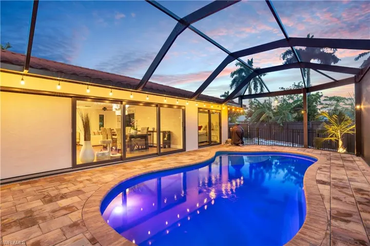 This centrally located, move-in ready residence on Marco Island features three bedrooms and two bathrooms. The open-concept home has been completely updated, with a full interior remodel in the past four years. The interior features a reconfiguration with the garage permitted and converted into a third bedroom. The kitchen has been upgraded with white cabinetry, large island with extra storage, beautiful countertops, a coffee bar with open shelving, refreshment fridge, stainless appliances, pot filler, with subway and mosaic tile backsplashes. Custom built in entertainment unit in living area, spacious bedrooms, 4 panel frosted interior doors, updated lighting, modern baseboard and wood look tile throughout, primary bedroom offers ensuite bath with updated vanities, upgraded tile shower and custom closet storage system. The AC system and ducts were recently replaced, and remote-controlled mini splits have been installed in all bedrooms. The home boasts impact rated windows and doors, a stone-coated metal roof, and an expansive eight-car capacity paver driveway. The outdoor area features a new pool with a paver deck, pool heater, pool equipment, and a picture view screen cage overlooking a tropical manicured backyard. Professionally designed landscaping by Square’s Landscaping with an upgraded low voltage landscape lighting system. A large wooden fence with double aluminum gates encloses the space, which allows extra room for a garage addition or additional living space. Close proximity to YMCA, Resident’s Beach and surrounded by multi-million-dollar waterfront homes. Being Sold AS-IS.