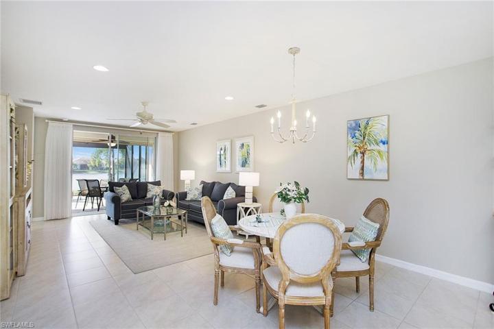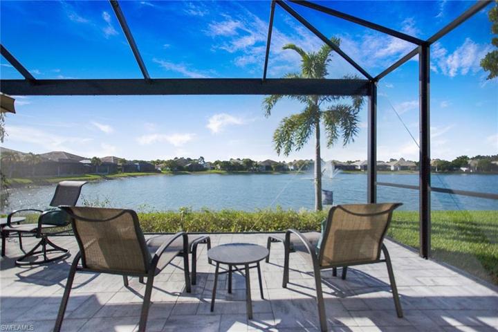 Incredible sunsets with this direct west-facing, immaculate, villa home on water with gorgeous fountain view! Loads of upgrades and room for a pool! This beautiful home is open, bright, inviting and is perfectly designed for seasonal use or full-time living in paradise. Featuring 2 bedrooms, 2 bathrooms, a den/flex space, 2-car garage and expanded lanai. Enjoy luxurious finishes and features throughout, including upgraded impact glass windows, custom hurricane screen, frameless glass shower door in primary bathroom, custom closets, screened entryway, laundry room with sink and storage and more. Completely turnkey, move-in ready. Community amenities include guarded gate, 22 lakes, 1-mile-long rowing lane, boat ramp, island club, fitness center, bocce ball courts, beach volleyball, tiki bar & café with food & beverage service, resort-style pool with lap lanes, fire pit, private Kontiki Island, Stand-up paddleboards, kayaks & bicycles, tennis courts, pickleball courts, 2 dog parks, miles of walking/biking paths, basketball court, and Kid’s Cove w/tot lot. Located in between 5th Avenue and Marco Island, this is the perfect location if you want to be near shopping, dining and the beach.