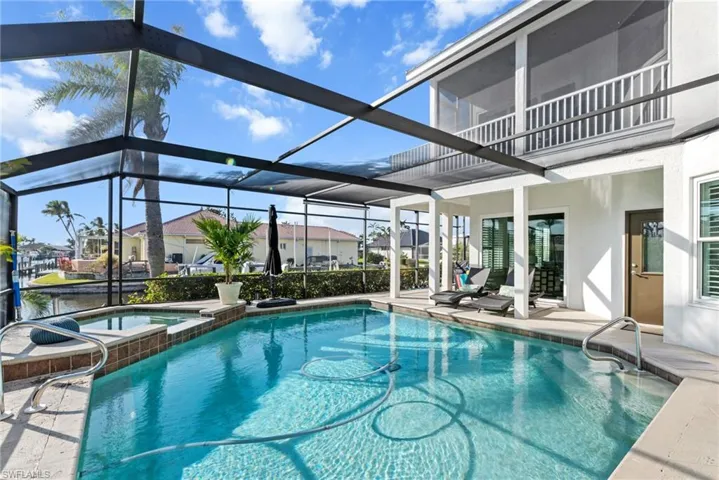 Spectacular home for yachting enthusiasts! Deep water, direct access just minutes to the river near Tarpon Point Marina with 210’ of water frontage. Includes a 75’ deep boat slip +2 boat lifts (13,000lbs and 20,000 lbs) Nestled at the end of a peaceful quiet cul-de-sac this spacious 4 bedroom 3 bath pool home features impressive 22 foot high ceilings, center Island kitchen with breakfast room, large family room with picture windows overlooking the intersecting canal view. The sunny, southern exposure pool area sparkles in the sun for all-day enjoyment! Additionally, the pool features an attached inground spa, salt system, and pool heater. A new metal roof was installed in 2023, with impact glass windows indoors throughout, plus an oversized two-car garage with enough land to add an additional two-car garage if desired. Secure your slice of paradise and begin enjoying Florida waterfront living at its finest.