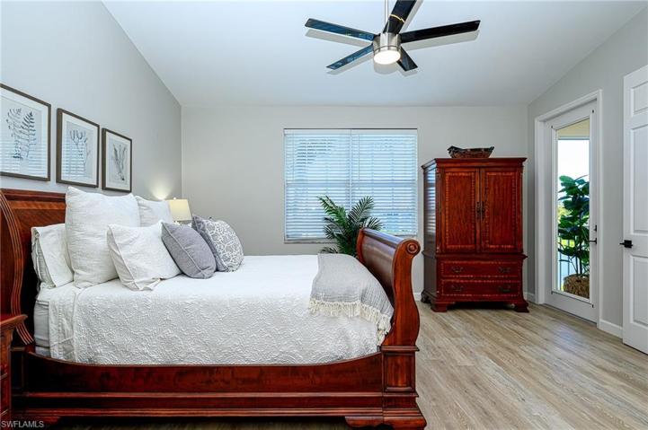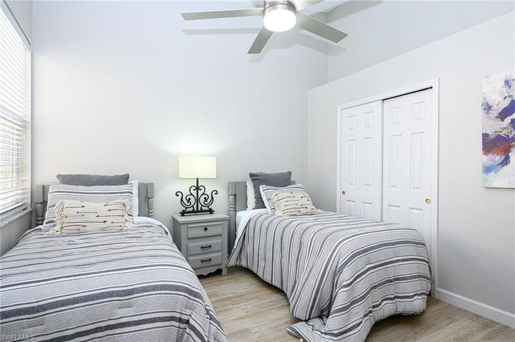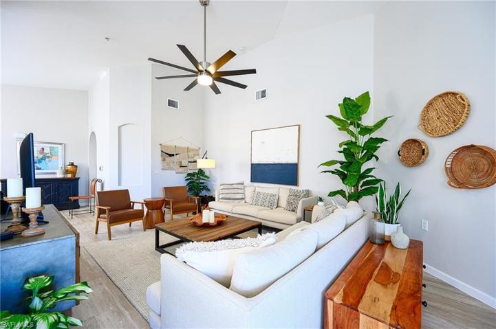 Discover refined living in this meticulously updated 2nd floor furnished end-unit condo, situated in the coveted North Naples community of Bridgewater Bay. The vaulted ceiling amplifies the spaciousness, creating an inviting atmosphere filled with natural light. The kitchen is a showcase of modern design, featuring stunning quartz countertops and Samsung stainless steel appliances. Luxury Coretec vinyl flooring graces every corner, combining style and resilience. Step into the screened lanai for a calming view of the lake and its lovely fountain, providing a serene backdrop for morning coffee and evening relaxation. The master suite exudes comfort, offering ensuite bath with double quartz vanities. Three bedrooms and 2 1/2 baths ensure ample space for family or guests. The unit has a newer roof and A/C system. Updated lighting and ceiling fans add a contemporary touch. Amenities include resort style pool & hot tub, lap pool, pickleball, fitness center, tennis & bocce, and much more. Located in close proximity to acclaimed schools, a diverse array of dining options, premier shopping destinations, and the pristine beaches of Naples. This is one of the nicest units you will ever see!