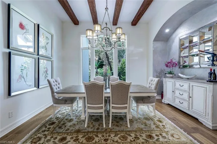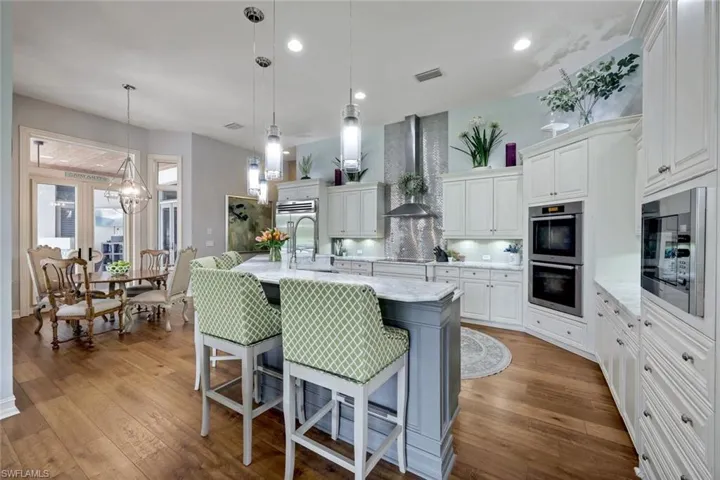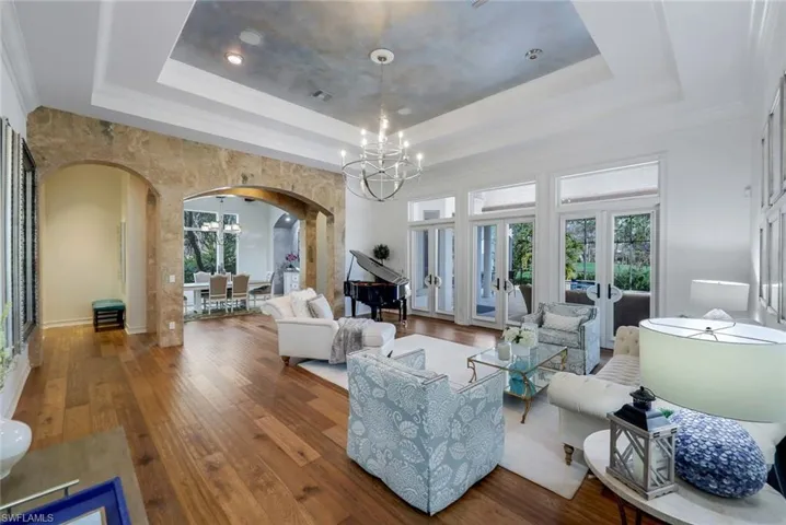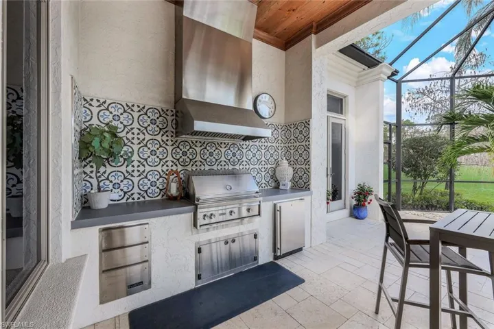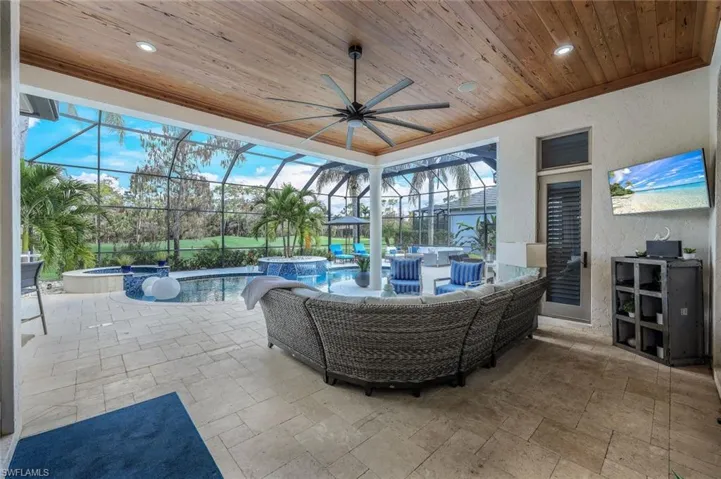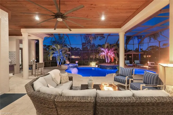 Step into your dream home & discover the allure of this exquisite residence within Olde Cypress community in Naples. Housing four bedrooms, a den, and five bathrooms (including the guest cabana, which was an addition in 2020), this home has been meticulously designed to meet your every need. Imagine preparing meals in the gourmet kitchen adorned with Wolfe + Meile appliances, brushed Carrara marble countertops, a Sub-zero refrigerator, and a spacious walk in pantry. The open-concept layout provides panoramic views of the exclusive 18-hole championship golf course designed by P.B. Dye and artistically designed resort-style pool and spa. The outdoor area, dotted with palm trees & travertine flooring offers an atmosphere of tranquility. It includes a built-in kitchen, lounge area under a spectacular peck cypress ceiling. Additional features such as a cascading spa, water features, and LED pool lighting maximize the enjoyment of Florida’s outdoor lifestyle. The primary suite is generously sized and includes a spa-like bathroom with a modern style free-standing tub, stand alone shower, dual sinks, stylish vanities, and Carrara marble counters. Custom walk-in closets add to the suite’s comfort and elegance. The home also has beautiful marble and Wine Oak Barrel Wood flooring throughout, coffered ceilings, five sets of French doors providing access to the outdoor area, a three-car garage, and a circular driveway. Home is furnished with some exclusions (see list in supplements). Golf & social memberships are available. Residents of Olde Cypress benefit from amenities like tennis and pickleball courts, fitness facilities, and dining options in the 36,000 sqare foot community clubhouse. For a private tour of this impressive property, call today.