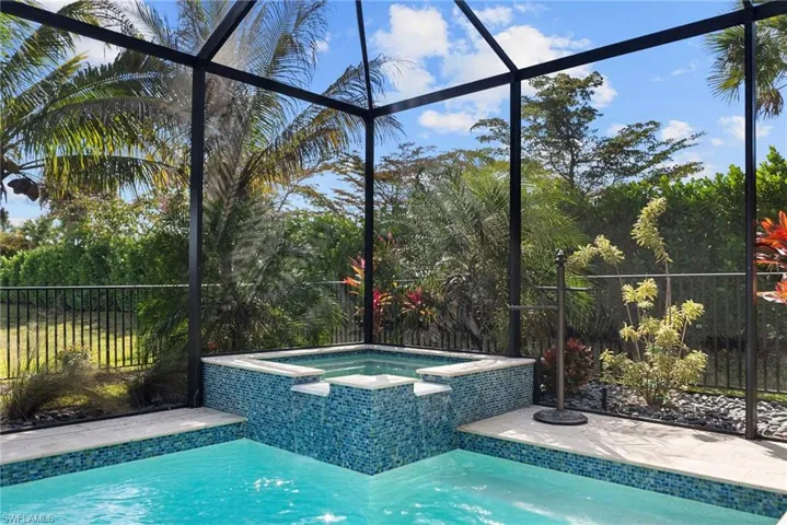 Welcome to this beautifully upgraded Flamingo floorplan in Valencia Trails, Naples’ premier natural gas community. Situated on a desirable corner lot, this 2-bedroom plus den, 2-bath residence offers a bright, open layout designed for both everyday comfort and effortless entertaining. The home features new tile flooring throughout, enhancing the clean coastal aesthetic and providing durability with easy maintenance. The spacious great room flows seamlessly into the chef’s kitchen, complete with natural gas cooking, quartz countertops, abundant cabinetry, and an oversized island ideal for gathering with family and friends. The versatile den provides the perfect space for a home office, media room, or additional guest accommodations. The primary suite is a private retreat with custom closets and a well-appointed bath, while plantation shutters throughout add both style and functionality. Step outside to your private resort-style lanai featuring a gas-heated pool and spa and a fully equipped outdoor kitchen, creating the ultimate space for year-round indoor-outdoor living. Valencia Trails is a natural gas community located just minutes away from shopping and dining and provides a new standard of 55 plus living by offering an exciting vacation-inspired lifestyle that rivals the finest resorts. The opulent 42,000 sq. ft. Clubhouse and Lifestyle Complex offers hundreds of exciting events including Broadway style shows, matinees, cocktail parties and galas. A full-time, on-site lifestyle staff ensures that there is something for everyone to enjoy.