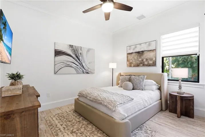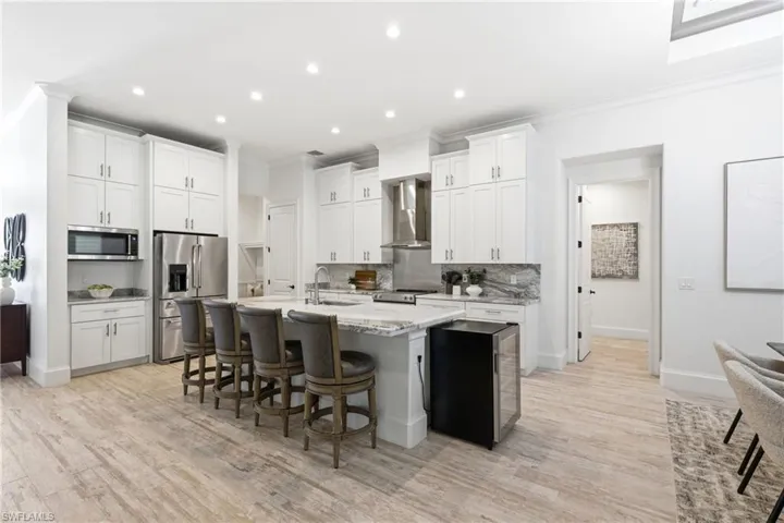 Set on a 1.25-acre parcel in San Carlos Estates, this custom-built residence delivers the space, privacy, and freedom that are increasingly hard to find—no HOA, no compromises, and no one looking over your shoulder. Surrounded by a canopy of Florida pines, the setting feels tucked away and tranquil, yet remains just minutes from everyday conveniences, dining, and the continued revitalization of Old Bonita, where local favorites, new restaurants, and a growing arts and culture scene are redefining the area’s appeal. Inside, a clean, modernized interior unfolds with a bright, open-concept layout designed for effortless living. Impact-resistant windows and doors invite natural light while offering peace of mind, complementing wide expanses of porcelain tile flooring and a cohesive, elevated aesthetic throughout. The great room serves as a striking focal point, where detailed carpentry—including a coffered ceiling and feature wall—is beautifully highlighted by fresh paint that enhances depth and contrast and newer light-filtering shades throughout. At the heart of the home, the gourmet kitchen impresses with exotic quartzite countertops, soft-close cabinetry, and a full suite of KitchenAid appliances, seamlessly connecting to the main living spaces. The thoughtfully designed floor plan includes four bedrooms plus a den, offering flexibility for work, guests, or creative pursuits. The primary suite is a retreat of its own, featuring a custom-designed closet, a freestanding soaking tub, dual vanities with a dedicated makeup station, and a calming, spa-like ambiance designed for unwinding at the end of the day. Outdoors, the property lives just as expansively. A silver travertine patio creates a refined setting for outdoor living, while the generous acreage offers ample room to design your dream pool, guest house, or additional outbuildings. Mature landscaping, a five-zone irrigation system, an oversized three-car garage, and a sweeping driveway complete the offering. A private, acreage lifestyle paired with modern design, generous space, and a location that keeps you connected—this is San Carlos Estates at its best.