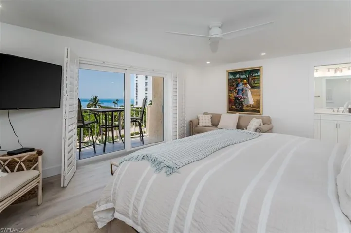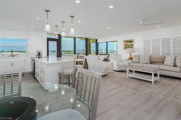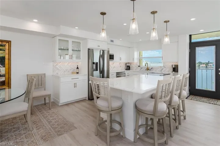 WOW! The view of the Bay from the 5th floor is huge! There is a View of the GULF as well, from the Primary Bedroom. This is a FULLY REMODELED 3 Bedrooms and 2 Baths as of 9/2024!! All new appliances, TANKLESS Hot Water Heater, ROOF New as of 2020! Furniture all NEW Fall of 2024. Being sold FURNISHED. Community Guest Condo available for overflow Family and Friends. A Grilling Terrace with dual ends, each equipped with a Grill, is all NEW! Here you will find 6 tables and chairs so you can dine and watch the Boats and Dolphins go by! The Bay provides a Twinkling Nighttime experience with all the lights from the homes across the water and the Boats coming in. WALK to Venetian Villiage for Shopping, Dining, and entertainment. An Open, large Landing is found on the 5th floor for more relaxing and entertaining space! This building is elevated at 8′! NO WATER intrusion in 2022 storm! La Maison is a very friendly community of 64 residences. There is a great Social life here for all who want to participate! Book your showing now!