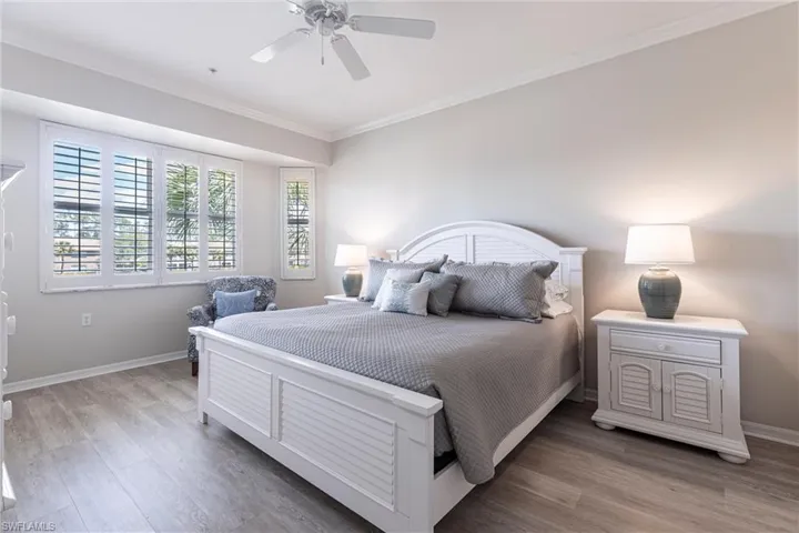 Step into the epitome of elegance with this meticulously designed TOP-FLOOR garden home END UNIT, where breathtaking views of the golf course and serene lake unfold before you from your generous, screened lanai and walking distance to the community pool. This exquisite residence is a testament to refined living, showcasing designer finishes and an unwavering commitment to detail that harmonizes style with functionality. Every room has been thoughtfully curated to cultivate an inviting ambiance, featuring soaring volume ceilings and a private one-car garage. Completely remodeled from floor to ceiling, this splendid home boasts luxurious Quartz countertops, new appliances including washer and dryer, updated hardware throughout, stylish fans, impact doors and windows and fresh paint throughout, including the garage. The new faux wood flooring adds warmth, while carefully selected furnishings grace every space, including the lanai and front sitting area. Additional enhancements include a new hot water heater and a phantom screen on the front door, allowing gentle breezes to flow from the lanai through the heart of the home. With convenient access to the pool and the INCLUSION of a FOUR PASSENGER GOLF CART AND BICYCLES, every day is an opportunity for leisure and enjoyment.