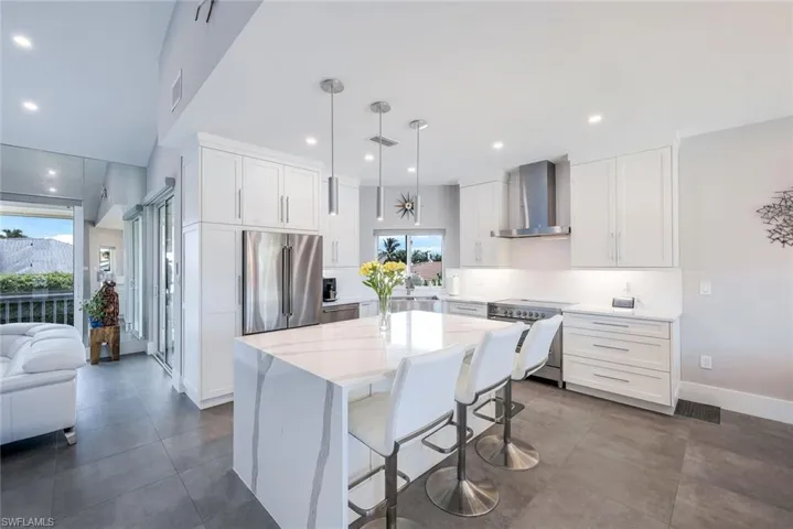 Located at the end of a quiet cul-de-sac in the desirable Tigertail Beach neighborhood, this beautifully renovated 3-bedroom, 2-bath elevated home offers the ultimate island retreat on an oversized lot. Step into a bright, open-concept layout featuring vaulted ceilings, impact windows and sliders, and a sleek modern kitchen with a quartz countertops, stainless steel appliances, and waterfall island. The main living space flows seamlessly to a large screened lanai, ideal for indoor-outdoor entertaining.
