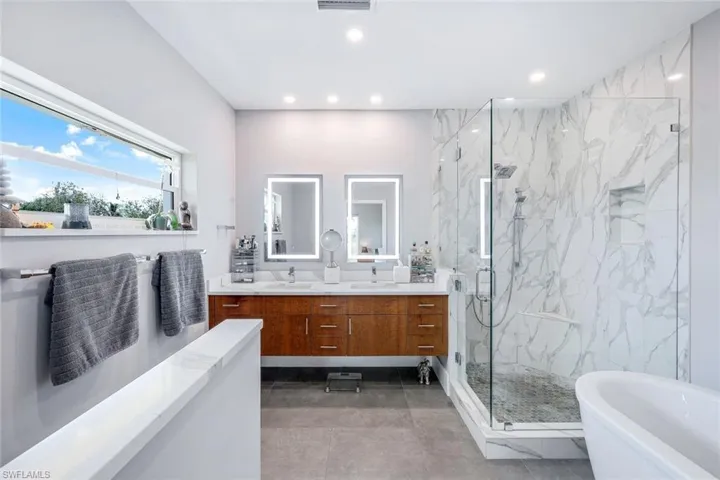 Downstairs, your private resort-style pool area is surrounded by lush tropical landscaping including a peaceful koi pond and includes ample shaded seating and a charming pergola lounge. The primary suite is a relaxing oasis with a spa-like bath, dual vanities, oversized walk-in shower, and soaking tub.