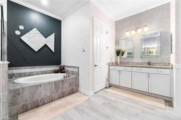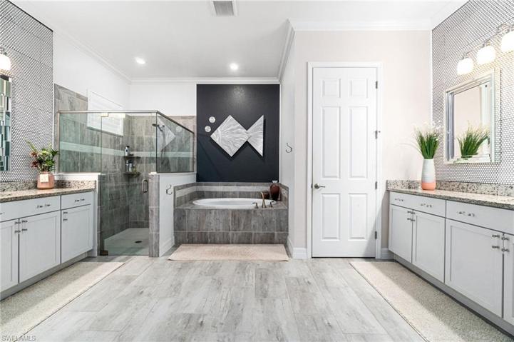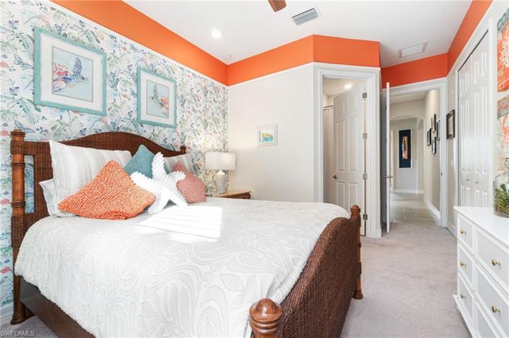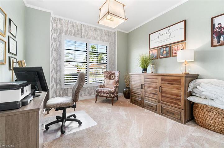 Welcome to 2110 Antigua Lane! This home is part of the manor home collection in the gated community of LaMorada in Naples. LaMorada offers amenities of big communities, while maintaining the small community vibe. LaMorada is a natural gas community and offers many amenities such as: pickleball, tennis, bocce, fitness center, theater, resort style pool and bar, culinary arts studio and library. This Summerville model is being offered FURNISHED and offers a large entry foyer with double glass doors and an accent wall. As you enter the oversized entertaining space, you are overwhelmed by the expansive space and outdoor views. The kitchen boasts an 11-foot island, custom pantry, and a backsplash extending over the cabinets to the ceiling creating a chef’s dream. The dining space accommodates a large table, perfect for family gatherings. The living room is the unique feature of this home, with a custom designed wall for your large television which highlights the entertaining capabilities of this upscale home. There are 3 bedrooms and 3 full bathrooms. Each bedroom is decorated with custom wall or ceiling accents. The den/office is a beautiful space with 8-foot french doors and plantation shutters. The master bedroom has a quiet, serene feel with an accent wall, chandelier and two walk in closets. The master bathroom has two separate vanities, soaking tub and oversized shower. The custom wall art over the tub accents the space well. Outside, the lanai has an outdoor kitchen, a refrigerator, commercial grill and exhaust hood, marble counter tops, ample seating space and a wall mounted television which make for the perfect outdoor experience. This all overlooks the custom 15 x 32, salt water, heated pool. The pool contains a large sun deck with chairs for relaxing, a bubbler and waterspouts. There are also two built-in stanchions with coordinating planters. The decking is travertine tile that extends throughout the large cage which has panoramic views. Lighting for the yard, including lanai lights gives you a dramatic evening entertaining space. The 3-car oversized garage has three large overhead storage racks that allows for Florida living without the need for an off-site storage unit. There are impact windows and doors throughout. This home has been meticulously maintained and decorated with its color palate, light fixtures, and love to make this your piece of paradise in Florida.