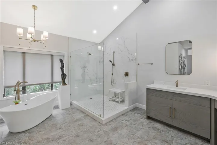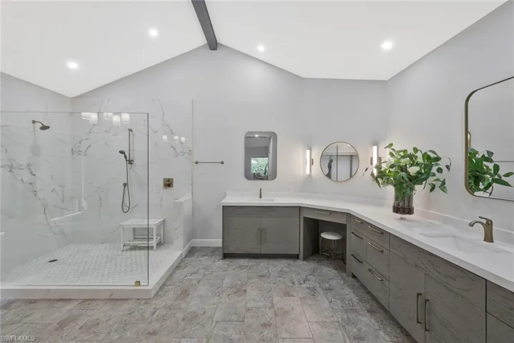 Perfectly positioned on a quiet cul-de-sac in the heart of Pelican Bay on a .36 acre lot, this one of a kind this iconic residence has been masterfully updated and offers the ideal blend of luxury, comfort, and location. Just moments from Artis-Naples, Southwest Florida’s premier performing arts center, Dramatic features the home features soaring ceilings and an impressive loft overlooking the main living area anchored by a cozy fireplace. The stunning updated kitchen showcases elegant Sea Pearl quartzite countertops, quality cabinetry, and generous prep space, while updated guest bathrooms add a fresh, modern feel throughout.