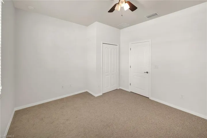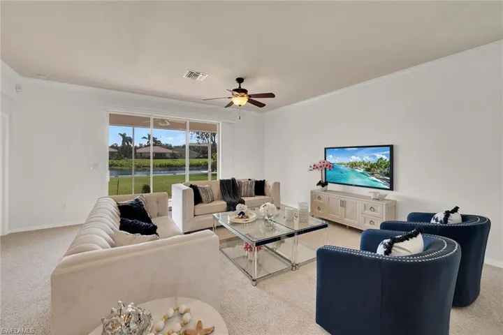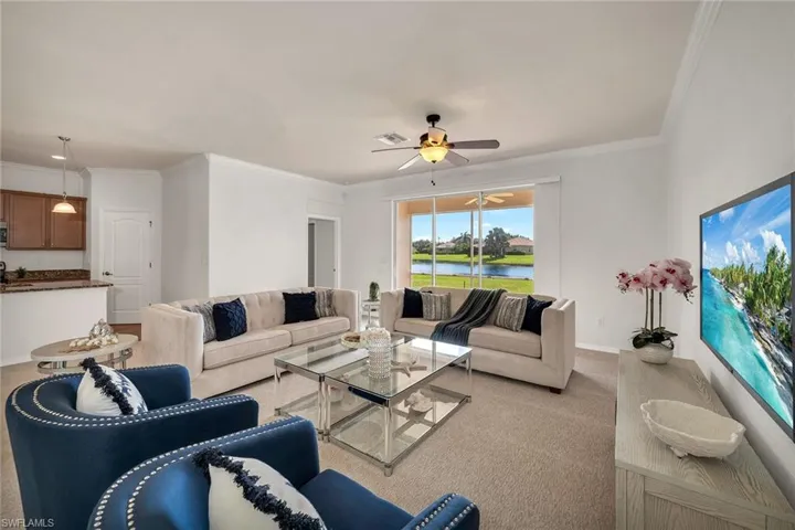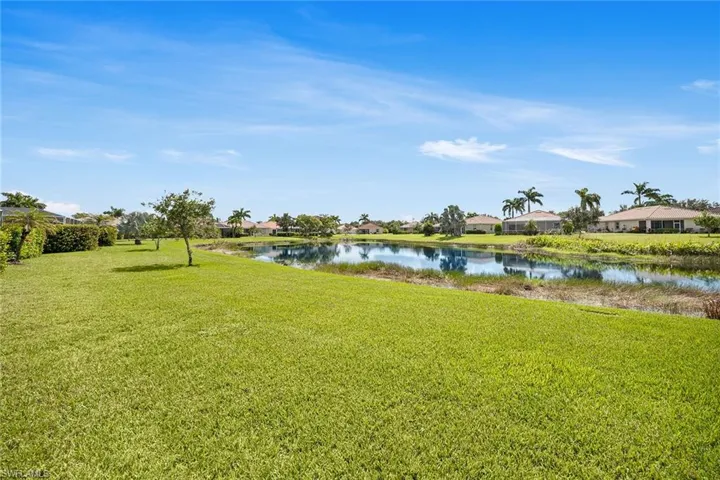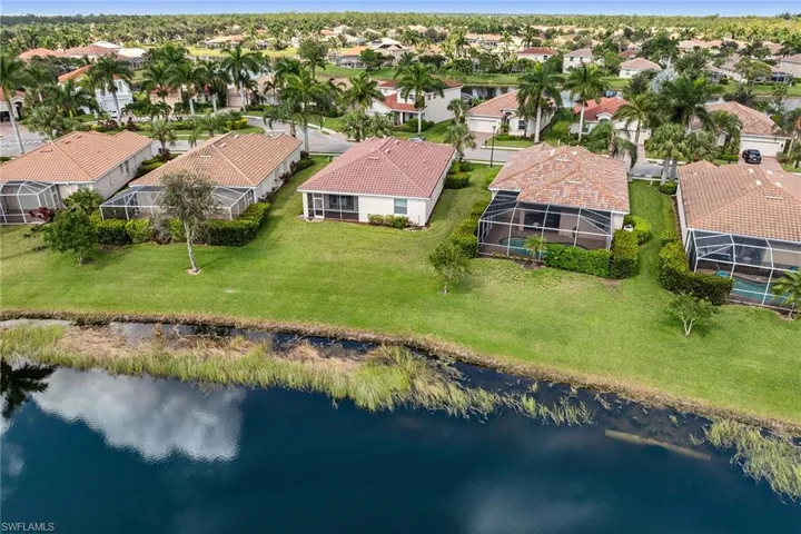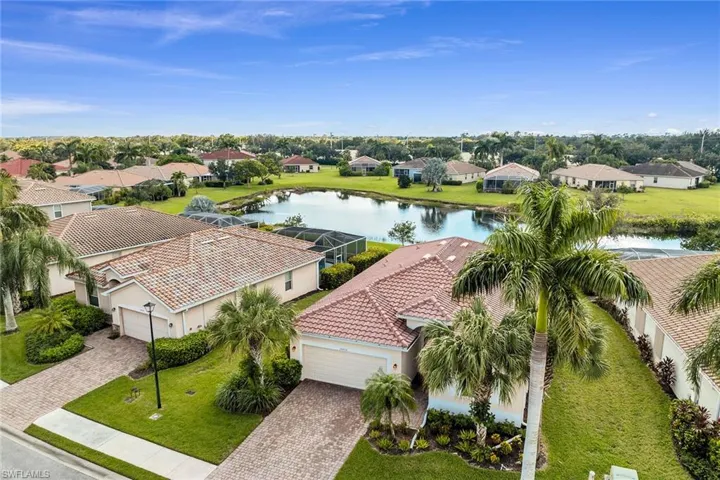 A stunning lakefront home in the desirable community of Reflection Lakes. This 2,032-square-foot residence offers an open and inviting floor plan with four bedrooms, three baths and a two-car garage. The home showcases breathtaking southwest lake views, ideal for enjoying serene sunsets. Exterior highlights include a tile roof, a paver driveway and walkway, lush tropical landscaping and a covered screened-in lanai ideal for outdoor relaxation. Inside, you’ll find plush carpet and elegant crown molding throughout the living areas, with wood plank floors in the foyer and kitchen for added warmth. The kitchen features shaker-style cabinets, granite countertops, a spacious three-seater center island, a pantry and stainless appliances. The kitchen flows seamlessly into the dining and living areas, all filled with natural light and offering picturesque lake views, with direct access to the lanai through a glass slider. The spacious owner’s suite boasts two walk-in closets and an en-suite bath with a full-width mirror above a dual sink vanity, a walk-in shower, a deep soaking tub and a convenient linen closet. Two guest bedrooms share a well-appointed full bath, while the third guest room offers the privacy of its en-suite bath. Residents of Reflection Lakes enjoy resort-style amenities, including a community pool, clubhouse, library, billiards, fitness center and bocce courts. This home is an ideal blend of comfort, style and luxury in a prime location.