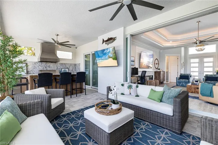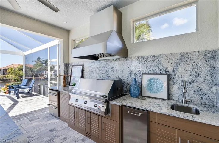 Enjoy spending hours at the pool, enclosed by a screened lanai that is large enough for outdoor dining, lounging and also has an outdoor shower. The outdoor kitchen, equipped with a full custom outdoor kitchen, inclusive of Bull appliances, wet bar, grill, composite cabinets and stone countertops. The saltwater pool and integrated hot tub are a focal point of the outdoor living area. The lanai overlooks a wide gulf-access canal where you can enjoy sunsets and sunrises on the new composite deck, where your boat is stored on the boat lift and under shade. Other notable features include the wood look tile that flows continuously, contributing to the light and bright feel of this beautiful Southwest Florida home; the lighted tray ceilings, custom window treatments, and 6 TV’s (one in each room, and outside), oversized 3 car garage with Epoxy coated garage floor, high ceilings, metal roof, impact windows and doors, Storm Smart Hurricane Shutters, professional and custom landscaping including turf on the sides and back of the home for easy maintenance; ample storage space makes life easier with electric overhead storage lifts in the garage; and custom landscape lighting on the lanai and in the garden. Home is for sale with furniture (some exclusions apply) or unfurnished.