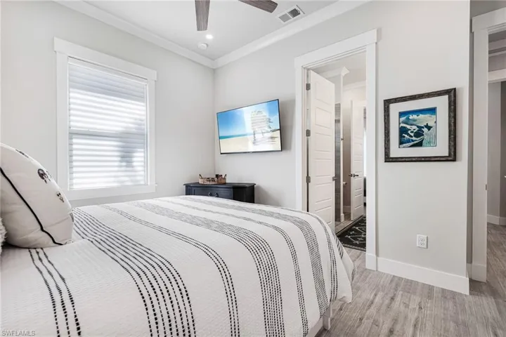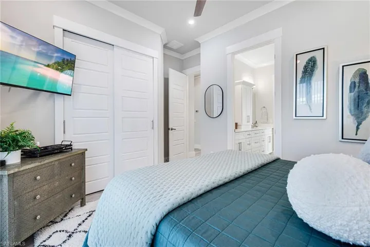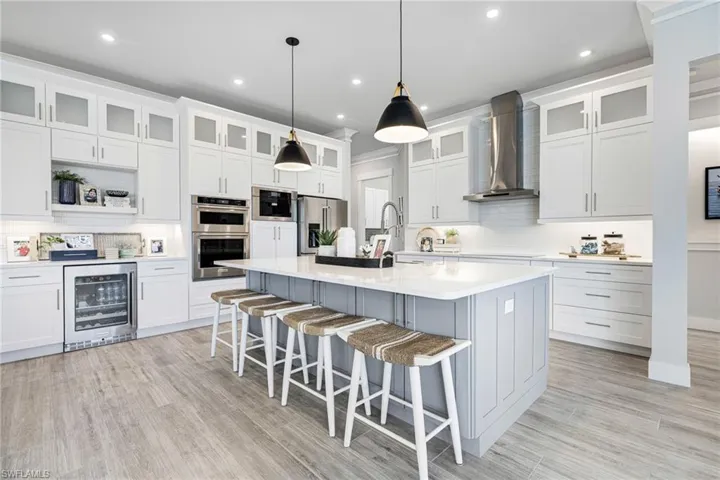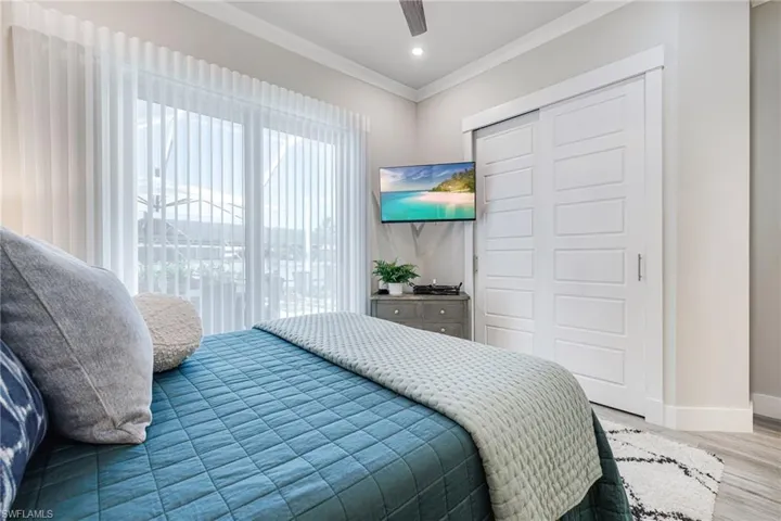 This home lends itself well to both relaxation and entertainment, offering ample space for friends and family alike. The kitchen is the center of the home, with modern and light quartz countertops, light color cabinets, and high-end stainless steel KitchenAid appliances, and a top of the line built in Miele coffee maker. Prepare a meal in the chef’s kitchen, and enjoy the casual dining at the island or for a more formal occasion, sit in the dining room that can accommodate a number of your guests overlooking the outdoor living area, pool, and canal.
