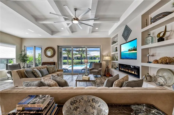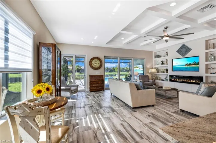 Built in ’23, like new, and offered FURNISHED, this particular Chandon Floorplan by GL Homes is sure to impress. At over 2,500 sqft, 3 Bedrooms + Den (that can easily be converted to a 4th Bedroom), and 3 Full Bathrooms, entertaining guests will come easy. You’ll find luxury at every corner of the home including plank tile flooring throughout, electric fireplace in the great room, a light and bright color scheme with custom Sherwin Williams paint, elegant lighting and custom window treatments, gorgeous granite counter tops, upgraded cabinetry with built-ins, upgraded appliances, a natural gas stove top, a large walk-in pantry, an extended pool with saltwater and autofill system, automatic roll down storm screen at the lanai, and impact rated windows and doors. Enjoy sunlight all day long at the pool with southern exposure, and sights and sounds of the Florida Wildlife overlooking the lake. Valencia Bonita is one of the most amenity rich communities in SWFL highlighted by a stunning 45,000 sqft Clubhouse, which includes a Resort Style Pool with “Zero Entry” and Lap Lanes, Restaurant/Bar, 8 Pickleball Courts, 8 Tennis courts, 2 Bocce courts, Fitness Center, Pro Shop, and Spa. If you want an active and social lifestyle, you will find it here. VB is a 55+ Community, but they allow for 20% to be under 55. VB is a natural gas community and does not have a CDD. Perfectly located in the heart of SWFL, minutes from the Airport, Beaches, Shopping and Dining and the future “Midtown at Bonita.”