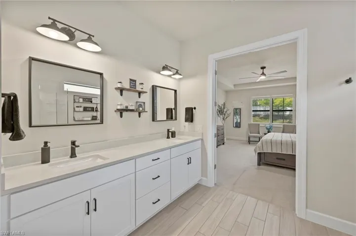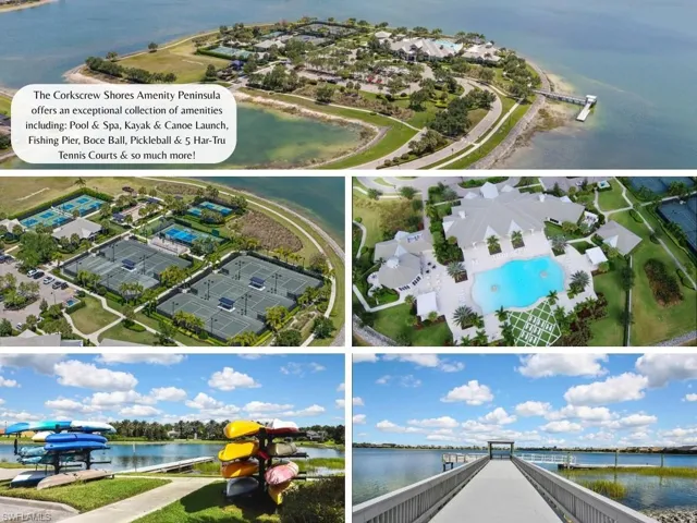 Welcome to your private retreat in the highly sought-after, gated community of Corkscrew Shores—where luxury living meets an active, resort-inspired lifestyle. Centered around a breathtaking 240-acre lake, residents enjoy kayaking, canoeing, and electric or wind-powered boating, along with world-class amenities including a resort-style pool and spa, state-of-the-art fitness center, pickleball, tennis and bocce courts, scenic walking paths, and the on-site Captain’s Club restaurant and bar. Additional amenities include a multi-purpose activity room, movement studio, massage therapy room, playground and picnic pavilion, and sports field, all complemented by a full calendar of clubs and social events that create a vibrant, connected community. This beautifully appointed Stonewater model offers 3 bedrooms + den and is perfectly positioned to enjoy it all—just a short walk to the community’s exceptional amenities. The spacious gathering room with coffered ceilings flows seamlessly into the heart of the home—the upgraded kitchen—featuring quartz countertops, 42” upper cabinetry, stainless steel KitchenAid appliances with built-in oven and microwave, and a walk-in pantry. Multiple dining options include a formal dining space, casual breakfast nook, and breakfast bar—ideal for both entertaining and everyday living. Stylish design details are found throughout, including custom wall accents and plantation shutters. A thoughtfully designed den adds valuable flex space, perfect for a home office, workout room, guest space, or whatever best fits your lifestyle. The owner’s suite serves as a relaxing retreat with a tray ceiling, dual vanities, walk-in shower, and an oversized walk-in closet. A private guest wing with pocket door separation and its own full bath provides comfort and privacy for visitors. Step outside to your own backyard oasis featuring a private pool and an expansive covered lanai, designed for effortless outdoor living, with ample space for dining, lounging, and entertaining year-round. The 3-car garage is designed with both function and lifestyle in mind, offering epoxy floors, overhead storage, an EV charging outlet, and plenty of room for a golf cart—ideal for enjoying all that Corkscrew Shores has to offer. Hurricane impact windows and doors provide added peace of mind. With NO CDD, NOT in a flood zone, and an exceptional blend of location, lifestyle, and amenities, this is a rare opportunity to own in one of Estero’s most sought-after communities. Discover for yourself what makes Corkscrew Shores truly special. Schedule your private showing to experience it firsthand.