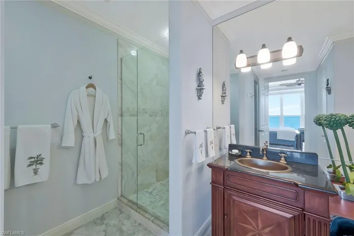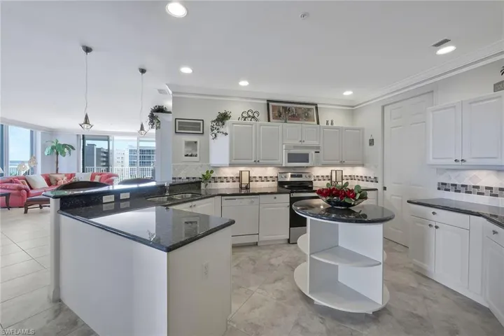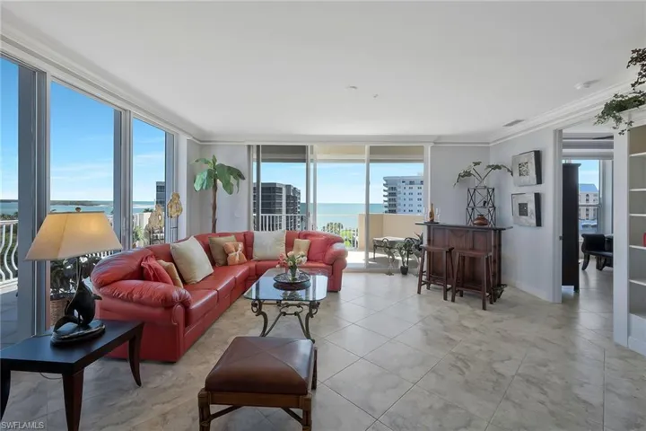 Exquisite half penthouse at Caxambas South Beach Terrace, offering stunning and forever wide water views of the Gulf and the famous Marco Island’s 10 Thousand Islands from every room. This exclusive residence epitomizes privacy, exclusivity, elegance and comfort. Upon entering, you are greeted by an inviting foyer that sets the tone for this luxurious abode. High ceilings amplify the sense of space, while the functional kitchen with granite countertops and backsplash is a culinary enthusiast’s dream. The cozy fireplace adds warmth and charm, and the adjacent bar promises endless happy hours of delight. The desirable open floor plan harmoniously integrates a classy dining room with a casual coastal living room, creating a seamless flow. Three spacious bedrooms each boast en-suite full baths, complemented by a powder room for guests. With large closets and ample storage throughout, practicality meets luxury at every turn. The spectacular wrap-around, 180-degree open terrace is the ideal setting to entertain, relax, and be mesmerized by breathtaking sunrises and sunsets. Witness the vibrant boating activity, listen to birds singing and watch dolphins swimming, all from the comfort of your terrace. Additional features include a private enclosed garage, washer and dryer in the unit, high-impact windows and electric shutters, providing extra peace of mind. This one-of-a-kind half penthouse is offered fully furnished, ready to move in. Paradise living at its finest.