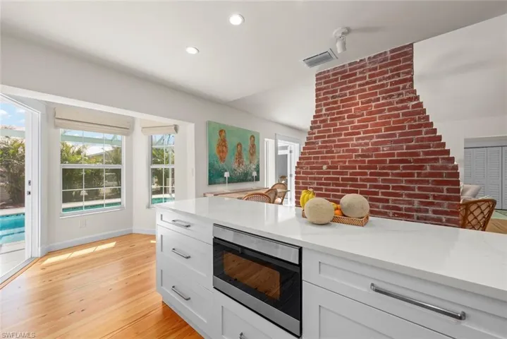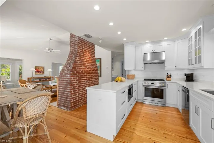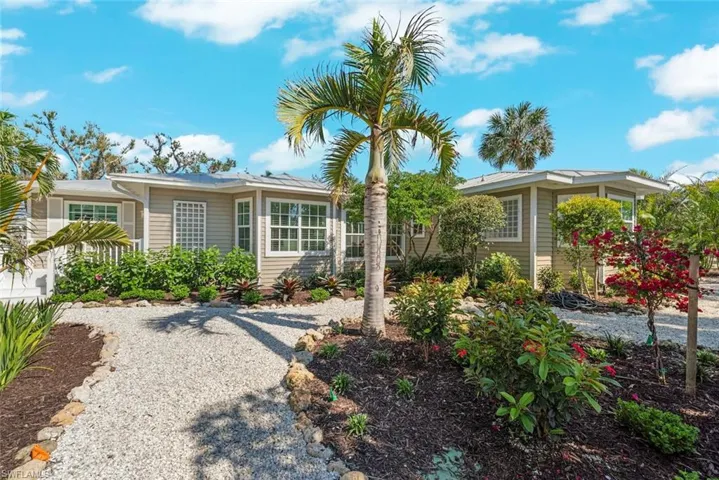 A step back in time with modernized comfort. This wonderfully charming elevated cottage with detached garage and cabana bring back memories of Olde Sanibel. Lovingly restored with yellow heart of pine flooring, and a freestanding wood-burning brick fireplace with Gas insert in the main living area with vaulted ceilings and walls of impact glass to bring in the natural light. This gorgeous remodel features a stunning kitchen with quartz countertops, custom cabinetry, and a slide in gas range. The home wraps around a freeform screened in pool area, which is very private. Deceivingly spacious with four bedrooms and four baths this home flows beautifully with no wasted space along with multiple decks for relaxing and or entertaining. All of the bedrooms are en suite. The primary retreat overlooks the sparkling waters of the pool and has two walk-in closet closets, along with a commodious bathroom, offering a separate tub and shower. In addition, there are two living spaces alongside an office. Gorgeous grounds with meandering coral rock bordered shell paths complement the tropical mature vegetation around the property. An exceptional location with deeded San Carlos Bay beach access a mere 250 feet from the property along with deeded beach access to the Gulf of Mexico a 250 feet from the property. Another positive feature for privacy is the unbuildable parcel to the north. Just a steps away from the east end Village of Sanibel Island, offering boutique shopping, an award-winning restaurant, an eclectic deli, not to mention the world famous historic Sanibel Lighthouse, and famed fishing pier along the sandy shoreline at the eastern most tip of the island. Charming is an understatement. This is island living at it’s best!