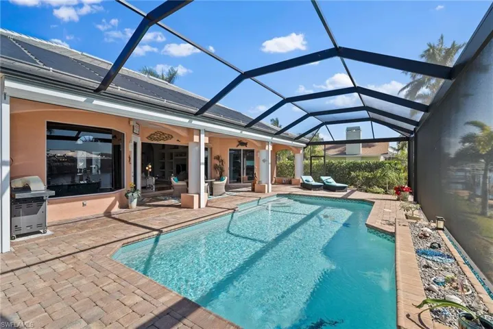 Outdoor living is the highlight: a solar-heated pool, large paved pool deck with panorama screens, and an expansive dock with boat lift and Tiki hut, perfect for relaxing, entertaining, or enjoying sunset canal views.